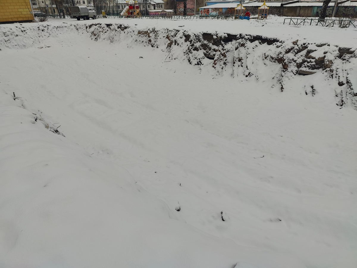 От подписчика: Дом по улице Февральской Революции снесли, а оградить забыли. Огромный котлован, глубиной до 3-х метров. Сейчас все засыпано снегом и сливается с дорогой, т.е котлован очень просто не заметить и нехило так в него улететь кубарем. Почему нет ограждения в виде даже самого просто деревянного забора?
