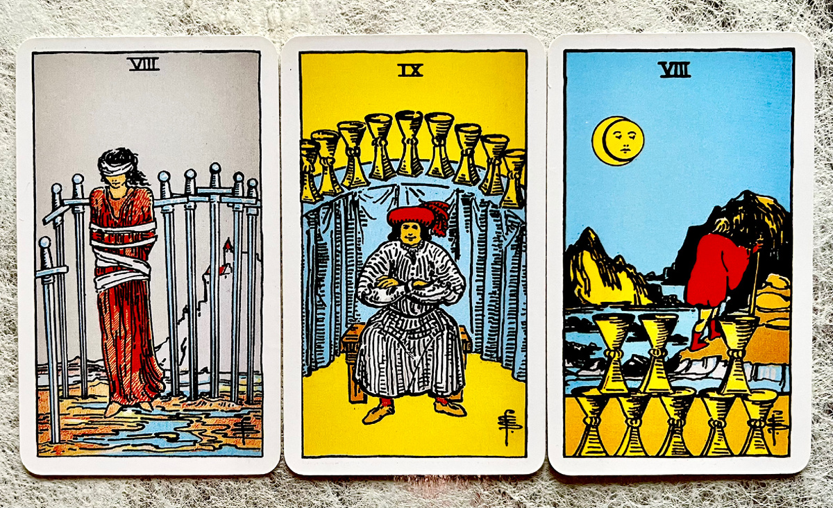 Сделав один решительный шаг, дальше вокруг вас закрутятся позитивные события... Не привыкайте к тому, что сейчас вас ограничивает, истощает, забирает энергию. А в поле у вас такая ситуация уже сложилось – это либо отношения, которые не дают двигаться к мечтам, либо образ жизни, который вы поддерживаете и не находите сил что-то кардинально поменять, либо работа, на которой нет перспектив. Словом, вы сами себя загнали в некую ловушку. 8 мечей – это клетка, но прутья ее - ваши собственные страхи и сомнения. В этой карте человек отказывается видеть истинное положение дел. Что вы делаете? Вы притворяетесь, что клетка очень даже уютная и чудесная. Следующая карта, как слайд - картинка, созданная сознанием. Если закрыть глаза, можно вообразить, будто бы находишься на празднике жизни, являешься главным гостем, всё чудесно и замечательно. Но на самом деле это иллюзия и самообман. Если смотреть правде в глаза, то вы давно уже знаете: пора оставить насиженное место, решиться и отправиться новой