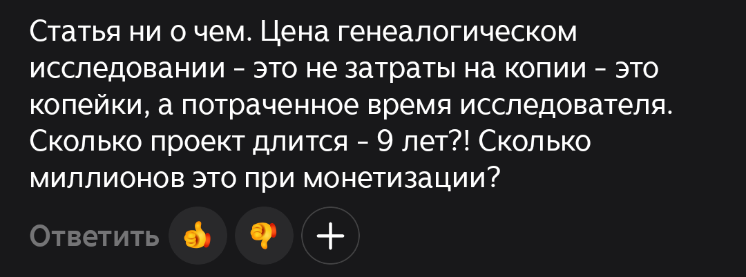 - Невнимательность. Нет, проект по генеалогической реконструкции не длится 9 лет — это время, прошедшее с момента начала моего увлечения генеалогией. Проект длится два года, но он построен на ранее выстроенном фундаменте (этапы 1-3). Это естественная эволюция любого серьезного хобби. Об этом в моей заметке говорится прямым текстом, но комментатор предпочел проигнорировать эту информацию. Почему?