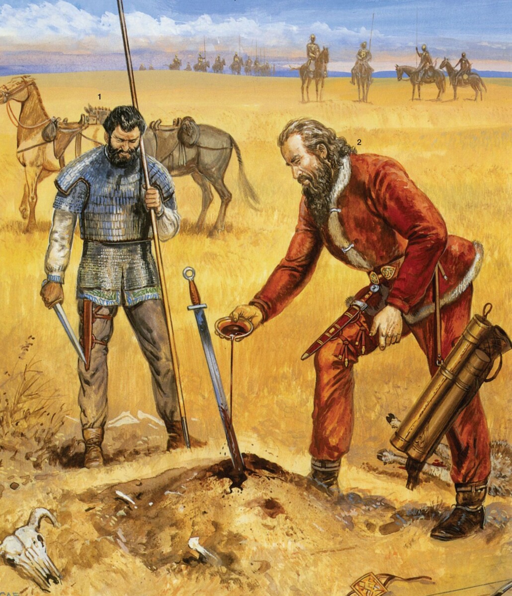 В религиозных представлениях ираноязычных кочевников древности и средневековья военный культ занимал особое место. Согласно Геродоту (V в. до н.э.), скифы почитали бога войны в образе железного меча, который устанавливался на вершине огромного алтаря, сложенного из вязанок хвороста. Не зная скифского имени этого божества, Геродот называет его Аресом, т.е. именем греческого бога войны. Через восемь веков после Геродота о почитании бога войны в образе меча у близкородственных скифам аланов сообщает Аммиан Марцеллин (IV в. н.э.): «Они втыкают в землю по варварскому обычаю обнажённый меч и благоговейно поклоняются ему, как Марсу, покровителю стран, в которых они кочуют».