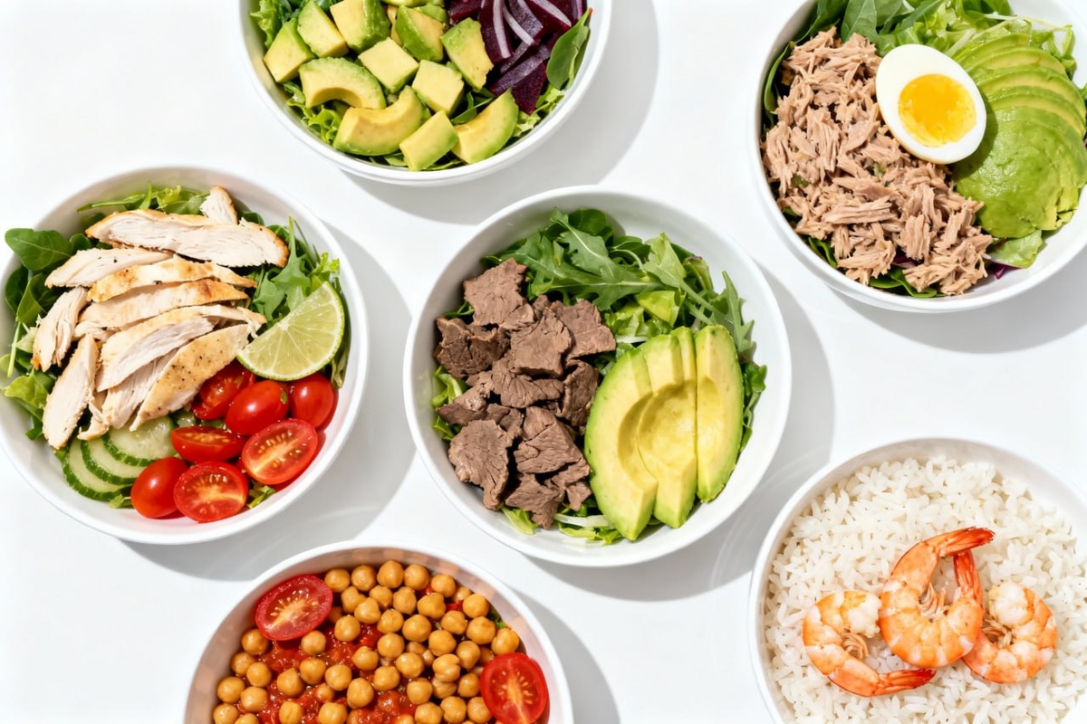 1️⃣ САЛАТ С КУРИЦЕЙ И АВОКАДО Простой способ приготовления ⏱️ 15 минут ✨ Ингредиенты на 1 порцию: Куриная грудка (отварная) - 200 г Авокадо - ½ шт Помидоры черри - 5 шт Листья салата - горсть Йогурт греческий - 2 ст.л Лимонный сок - 1 ч.л Соль, перец по вкусу КБЖУ на порцию: 🔴 Калории: 380 ккал ⚪️ Белки: 38 г 🟡 Жиры: 18 г 🟤 Углеводы: 12 г 🔄 Способ приготовления: Курицу нарезать полосками Авокадо очистить, нарезать дольками, полить лимоном Помидоры разрезать пополам Салат выложить слоями: листья, курица, помидоры, авокадо Заправить йогуртом с солью и перцем 💡 Замены: Курицу на филе индейки, йогурт на оливковое масло, авокадо на оливки 2️⃣ САЛАТ С ТУНЦОМ И ЯЙЦОМ Быстро и просто ⏱️ 20 минут ✨ Ингредиенты на 1 порцию: Тунец в собственном соку - 100 г Яйца - 2 шт (вареные) Огурец свежий - 1 шт Помидоры - 1 шт Листья салата - 150 г Оливковое масло - 1 ст.л Лимонный сок - 1 ч.л Укроп свежий, соль, перец КБЖУ на порцию: 🔴 Калории: 320 ккал ⚪️ Белки: 42 г 🟡 Жиры: 15 г 🟤 Углеводы: 8 г ?
