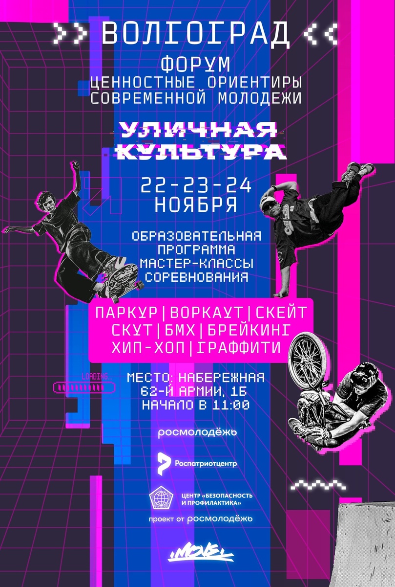 Форум “Ценностные ориентиры современной молодёжи” пройдет в Волгограде с 22 по 24 ноября С 22 по 24 ноября на Набережной 62-й армии, 1Б, стартует масштабный форум «Ценностные ориентиры современной молодёжи». Мероприятие, начало которого запланировано на 11:00, соберёт на одной площадке трейсеров, воркаутеров, BMX-еров, скейтбордистов, самокатчиков, а также представителей граффити, хип-хопа и брейкинга. В течение трёх дней участников ждёт насыщенная программа, объединяющая творчество, спорт и общение. Форум предлагает уникальное пространство для самовыражения, знакомств и досуга среди единомышленников. Паркур, как одно из ключевых направлений, наряду с другими уличными дисциплинами, формирует особую атмосферу, вдохновляющую на движение вперёд и личностное развитие. В рамках события запланированы не только зрелищные соревнования, но и образовательные блоки: лекции, мастер-классы, контесты и шоу. #паркур #соревнования Подробнее...