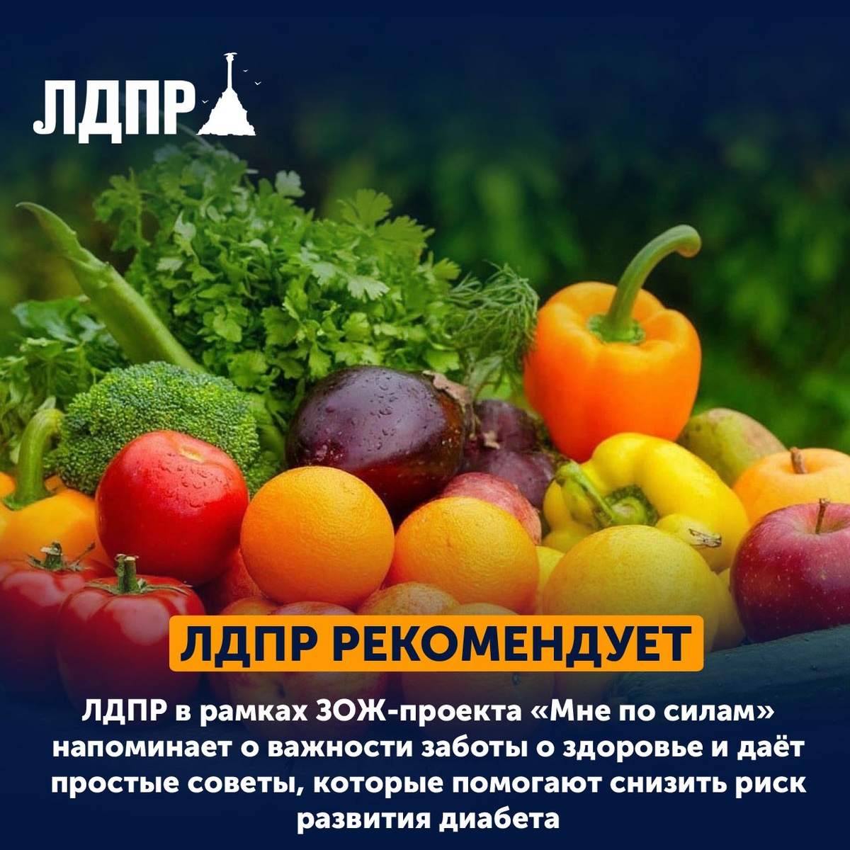 Советы от ЛДПР во Всемирный день борьбы с диабетом 💙 Севастопольское отделение ЛДПР в рамках ЗОЖ-проекта «Мне по силам» напоминает о важности заботы о здоровье и даёт простые советы, которые помогают снизить риск развития диабета: 🥗 Следите за питанием — больше овощей, фруктов, цельнозерновых продуктов; меньше сладкого и фастфуда. Двигайтесь каждый день — ходьба, лёгкая гимнастика, велосипед или плавание укрепляют сердце и поддерживают нормальный уровень сахара. 💤 Контролируйте сон — регулярный и полноценный отдых помогает организму правильно регулировать обмен веществ. ⚖️ Следите за весом — лишний вес повышает риск развития диабета. Маленькие, но постоянные шаги к здоровому образу жизни имеют большое значение. 🩺 Регулярно проверяйтесь — измерение уровня сахара и контроль давления помогают вовремя выявлять нарушения. Беречь здоровье — просто, если действовать ежедневно. ЛДПР в Севастополе поддерживает жителей в стремлении к ЗОЖ и внимательному отношению к себе.
