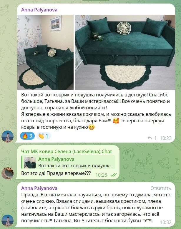 На днях в чате мастер‑класса "Селена" Анна прислала фото своего коврика и подушки — впервые связанных крючком! И написала несколько тёплых слов о том, как ей понравился мастер‑класс. Вы не представляете, как приятно видеть, что человек благодаря твоим мастер‑классам открывает для себя новый навык, а может быть и увлечение🤗 Анна влюбилась в крючок с первой попытки и теперь планирует связать ковры ещё для гостиной и кухни. Каждый раз такие моменты напоминают: это не просто мастер‑класс — это маленькое волшебство, которое остаётся с человеком надолго.