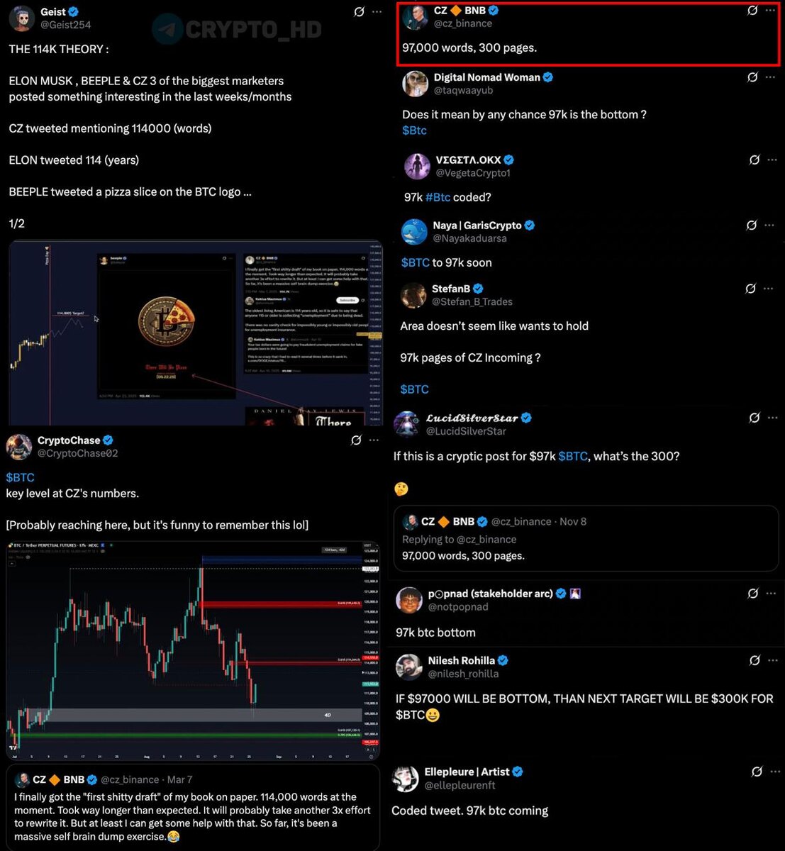 #конспирология ❌ Чанпэн Чжао - новая ванга? Конспирологи в Twitter отчаянно ищут пасхалки в постах CZ. Некоторые трейдеры всерьез обсуждают…не шифрует ли основатель Binance прогнозы по Биткоину в своих твитах. ➥ Когда BTC в марте скатывался к $84,000, CZ написал, что работает над черновиком книги на 114,000 слов – примерно через месяц биткоин пробил отметку $114,000. ➥ 8 ноября, при цене около $103,000, он упомянул, что черновик уже на 97,000 слов и 300 страниц. Биткоин сейчас стоит примерно $97,000. ➥ Число 114,000 уже «отработало», 97,000 – тоже. Осталась загадка: что означает число 300? Ряд энтузиастов верит, что это прогноз на рост Биткоина до $300,000. Crypto Headlines