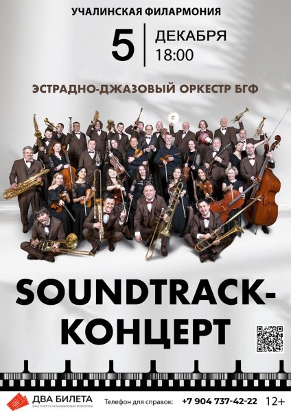 5 декабря 2025г. (12+) Эстрадно-джазовый оркестр БГФ дарит SOUNDTRECK-КОНЦЕРТ! Название программы говорит за себя: это узнаваемая, хитовая музыка, которая ненавязчиво сопровождает нас в повседневной жизни, звучит на популярных радиоволнах, выхватывает рингтонами из ежедневной круговерти. Этот концерт редкая возможность услышать своеобразный звуковой дайждест из голливудских фильмов в один вечер! ____________ Нач. 18:00 Билеты только в онлайн продаже по ссылке — https://clck.ru/3QJuVK цена от 800 р. Справки по т. т. 257-42-22, +7 904 737-42-22 ____________ Ссылка на покупку билетов онлайн предоставлена организатором мероприятия. Организатор ООО ДВА БИЛЕТА ИНН/ОГРН:0276974272/1230200009148 Юридический адрес: г. Уфа, село Нагаево, ул Пихтовая, д 95А https://clck.ru/3QJuVP, Правила возврата билетов — https://clck.ru/3QJuVR Учалинская филармония не несет ответственности за возврат средств за билеты, купленные на сайтах сторонних… https://uchaly102.ru/?p=110775