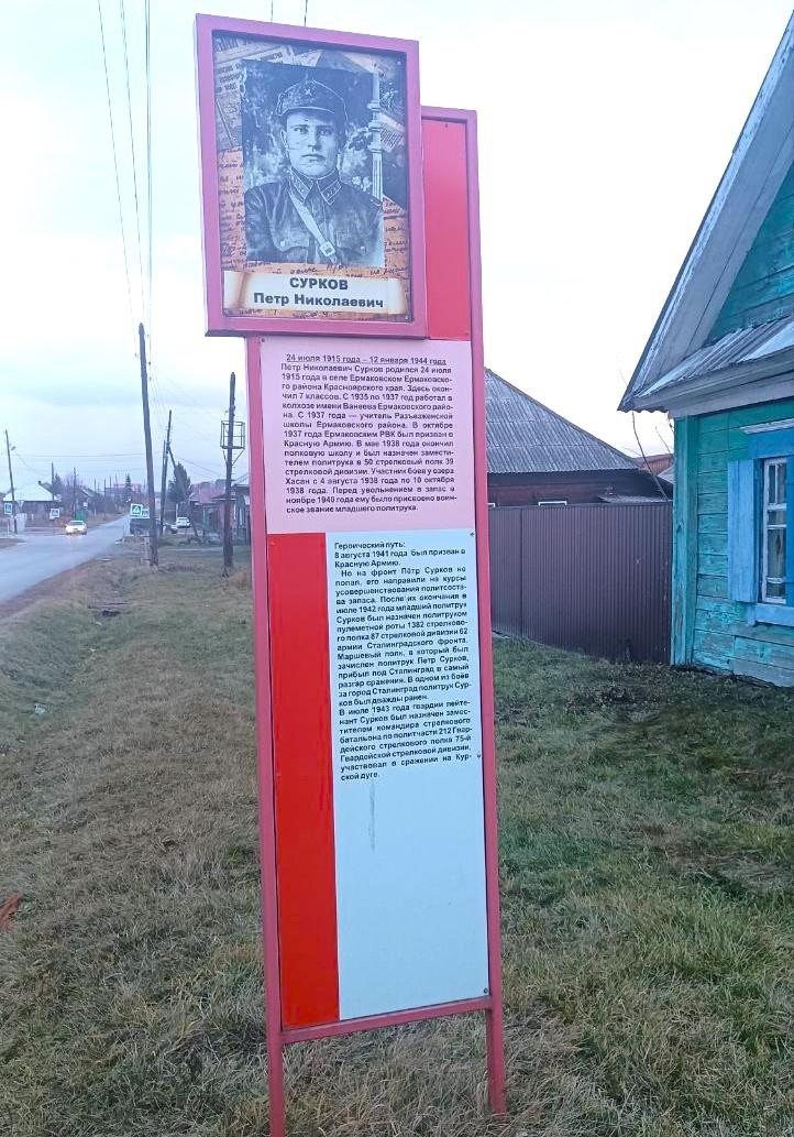 С 1941 по 1945 год Ермаковским районным военкоматом на фронт были призваны 5 594 наших земляка, вернулись домой лишь 1 732 человека, погибли 3 862 героя. Уходили целыми семьями. Среди наших земляков есть семь человек, которые были удостоены звезды Героя Советского Союза. Один из них – Пётр Николаевич Сурков. В 2025 году исполнилось 110 лет со дня его рождения и 70 лет улице имени Суркова.