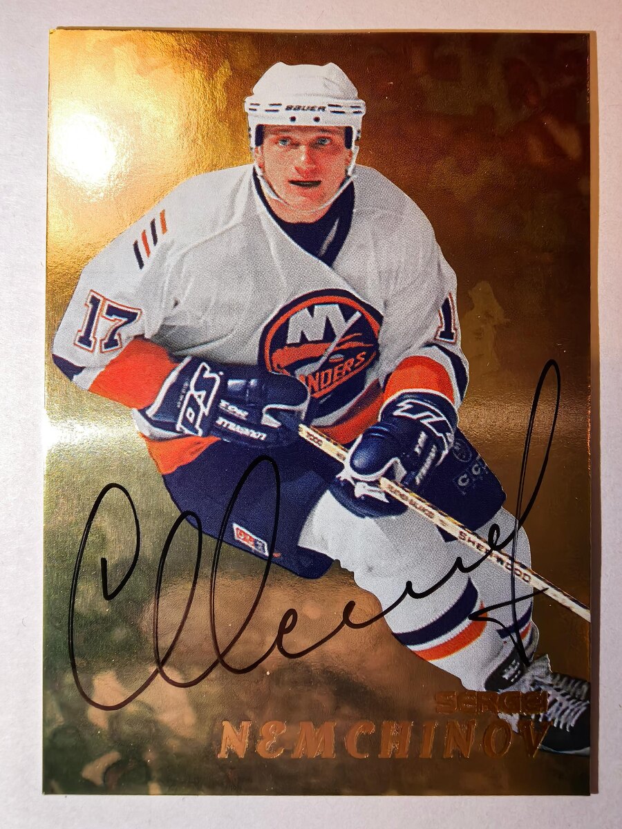 Сергей Немчинов 🏝 Золотой штрих эпохи, когда русские в НХЛ перестали быть заморской экзотикой 🏒 💎 Иногда достаточно одного взгляда на карту, чтобы вернуться в хоккей, который пах резиной, холодом и честной работой. Эта — как раз из таких. Золотой блеск, бело-синяя форма, и взгляд Немчинова, в котором всё то десятилетие: от трудовой смелости до интеллигентной дерзости русского форварда в НХЛ. Серия Be A Player 1998–99 вообще была про уважение к игроку — про тех, кто делал НХЛ живой. Но у Немчинова здесь особая роль. Он был из тех русских форвардов, кто не просто играл — он менял восприятие. Рабочая этика. Дисциплина. Тихая, но очень осязаемая лидерская энергия. И вот ты держишь в руках карту, которая будто подсовывает тебе кусочек того времени. Не тиражка. Не параллель. Просто чистый, честный автограф игрока НХЛ конца 90-х. Сергея Немчинова! Олдскулы свело и не отпускает⚠️ 🔤 Be A Player 1998–99 - Autograph - 237 Sergei Nemchinov RockstaSportCards - коллекционер для коллекцион