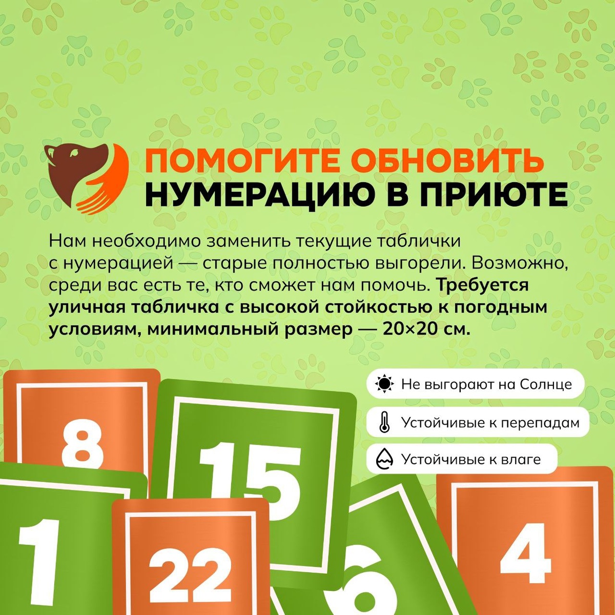 Друзья! Нам необходимо обновить нумерацию вольеров.Во первых прежние таблички уже выцвели,во вторых появилось достаточно много новых вольеров и порядок нумерации лишился логики 🤪 Поэтому нам нужно изготовить 130 новых табличек, размером примерно 20*20.Таблички должны быть для уличного использования,на жёсткой основе. Табличка простого типа- белая цифра на зелёном или оранжевом фоне. Если есть желающие помочь нам справиться с этой задачей,будем рады. 8-951-479-75-89