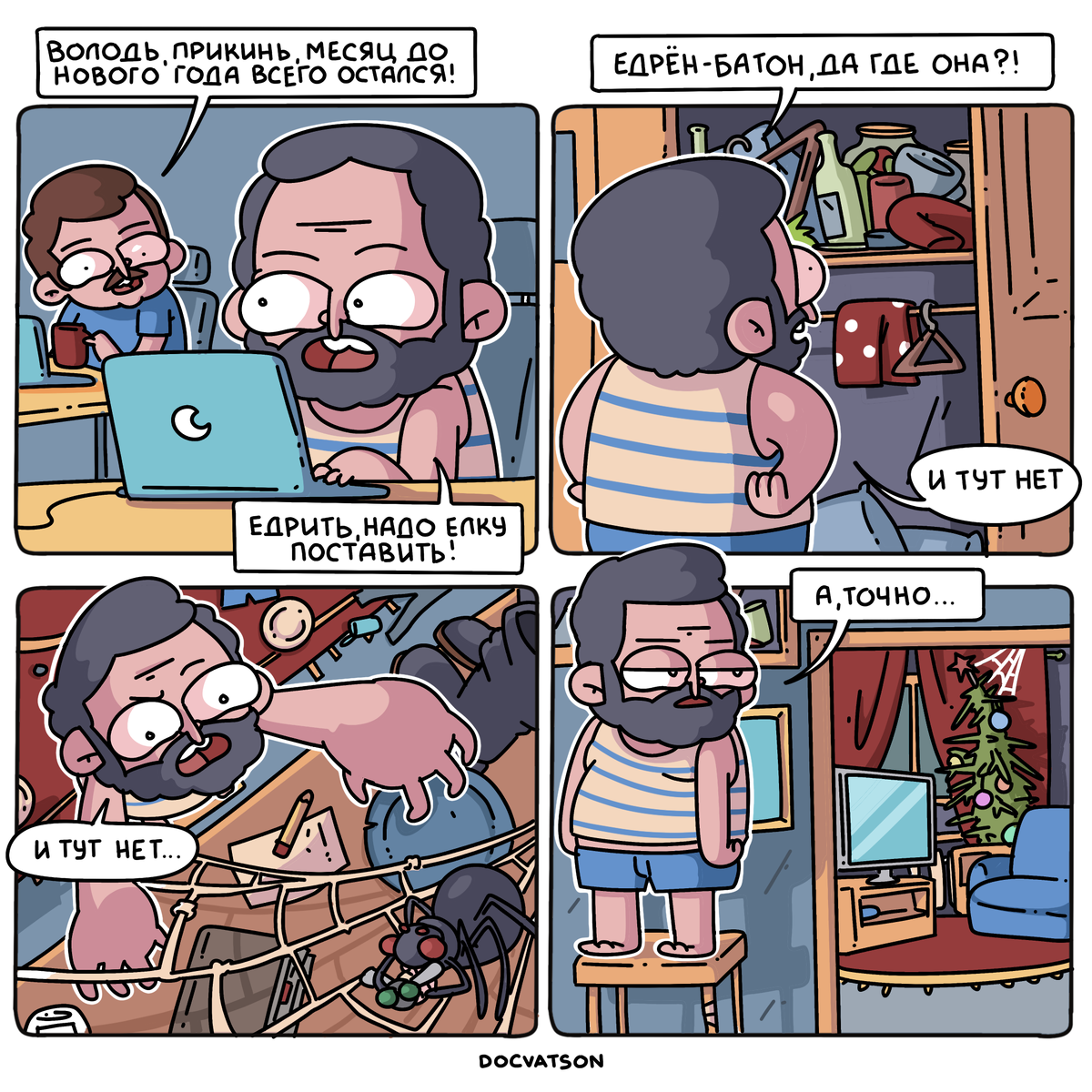 02.01 Пока праздники еще не закончились и новогоднее настроение не улетучилось, продолжаем заряжаться хорошим настроением от смешных комиксов и карикатур про подарки, елки и Деда Мороза! Сегодня я собрал для вас десять свежих смешных картинок на праздничную тематику - надеюсь, они вам понравятся. Ну и, конечно же, всех с наступившим! Комикс от московского художника Максима Конышева, также известного под псевдонимом DOCVATSON, выходил до Нового года, поэтому и тема в нем предпраздничная - подготовка новогодней ёлки. Хотя, по сути, этот сюжет вполне себе остается актуальным и весь остальной год. Литовская художница Герта Бурбе (Herta Burbė) рисует комиксы с завидной регулярностью и ко всем актуальным событиям у нее стабильно готова какая-нибудь смешная картинка - а то и не одна! Конечно же, к новогодним праздникам Герта Бурбе тоже кое-что нарисовала. Художник под псевдонимом Зайтишник в преддверии праздников нарисовал забавную открытку о том, что друзей по жизни нужно выбирать с умом. В