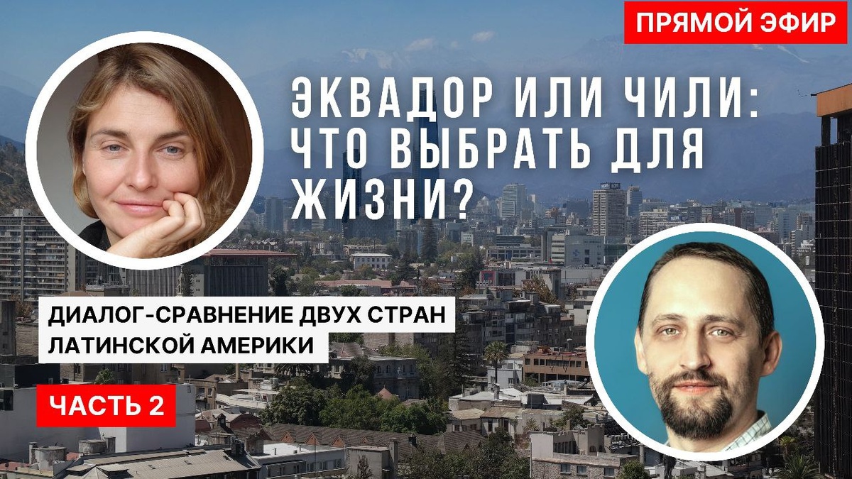 🔥 Анонс эфира №2 «Эквадор или Чили: что выбрать для жизни и эмиграции?» 📅 Вторник, 18 ноября ⏰ 19:00 по Москве / 11:00 по Эквадору Во второй части нашего большого разговора вместе с Артёмом из Чили мы сравним две страны Латинской Америки глазами тех, кто в них живёт и проходил путь эмиграции изнутри. 🟦 Что обсудим: 1. Почему именно Эквадор и Чили? Наши личные истории выбора. 2. Легализация: где проще получить ВНЖ и паспорт. 3. Цены и уровень жизни: жильё, продукты, транспорт — без приукрашивания. 4. Медицина и образование: качество, стоимость, доступность. 5. Безопасность: реальная ситуация, районы, ощущение на улицах. 6. Природа и климат: где комфортнее жить каждый день. 7. Работа и бизнес: возможности, ограничения, реальные перспективы. 8. Менталитет: кто более открытый — эквадорцы или чилийцы? 9. Плюсы и минусы каждой страны. 10. Советы тем, кто выбирает между Эквадором и Чили. Будет честно, живо и максимально полезно всем, кто рассматривает Латинскую Америку для