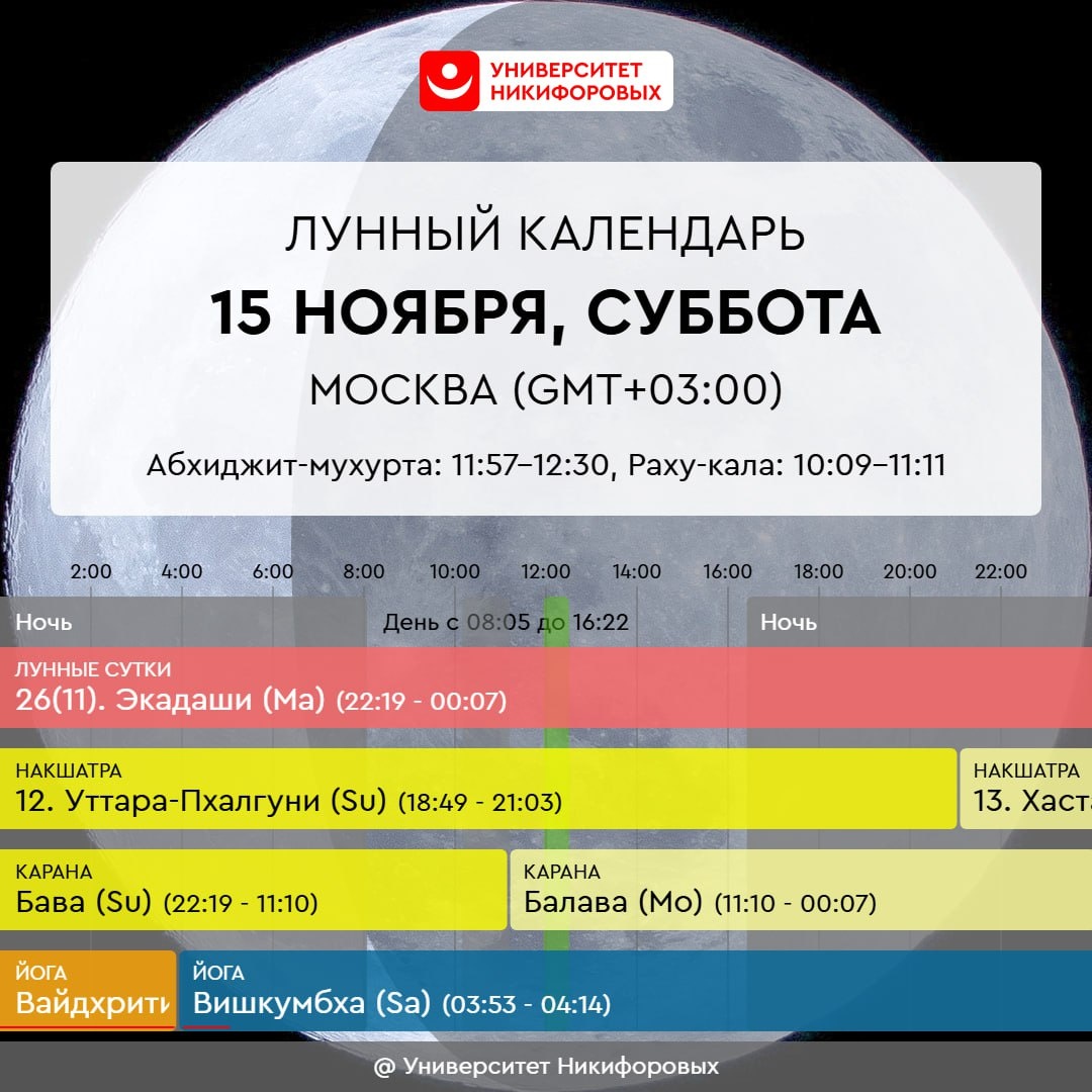 15 НОЯБРЯ, СУББОТА Неплохой по энергетике день, он не сулит нам золотые горы, но и не провалит нас в бездонные бездны. Это день, когда можно спокойно заниматься повседневными делами и отдыхать, без особого напряжения или бурных эмоций – все будет идти своим чередом, без значительных взлетов и падений. Найдите сегодня возможность побыть на природе, особенно если день выдался солнечным. Почувствуйте, как вы заряжаетесь энергией от мира и от Солнца. Попробуйте хотя бы на полчаса отключиться от телефона и всех уведомлений, поставив его на беззвучный режим. Позвольте себе просто быть, наблюдая за тем, что происходит вокруг, сосредоточьтесь на звуках, запахах и ощущениях, которые дарит вам природа. Сегодня Экадаши — день для разгрузки и очищения, который часто проводится в форме традиционного поста, исключающего зернобобовые и продукты животного происхождения, кроме молочных. Однако вы можете выбрать тот вариант соблюдения, который вам ближе: это может быть сухой пост, пост на воде, на фру