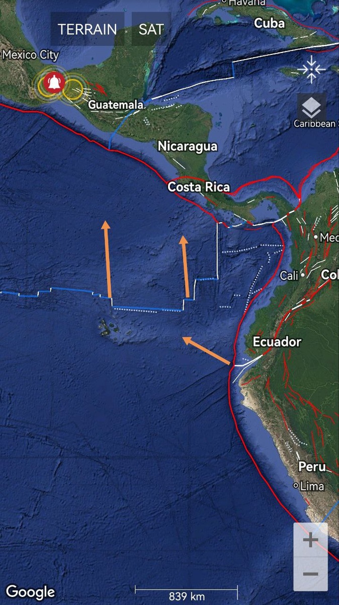 По логике смещения и форме вся эта облачная проекция от рифтовой зоны в Центральной Америке (Эквадор, Колумбия, Панама, Коста-Рика - плита Кокос и плита Наска) поворачивается по часовой стрелке. И поворачивается "качественно" - в сумме на М7-8.