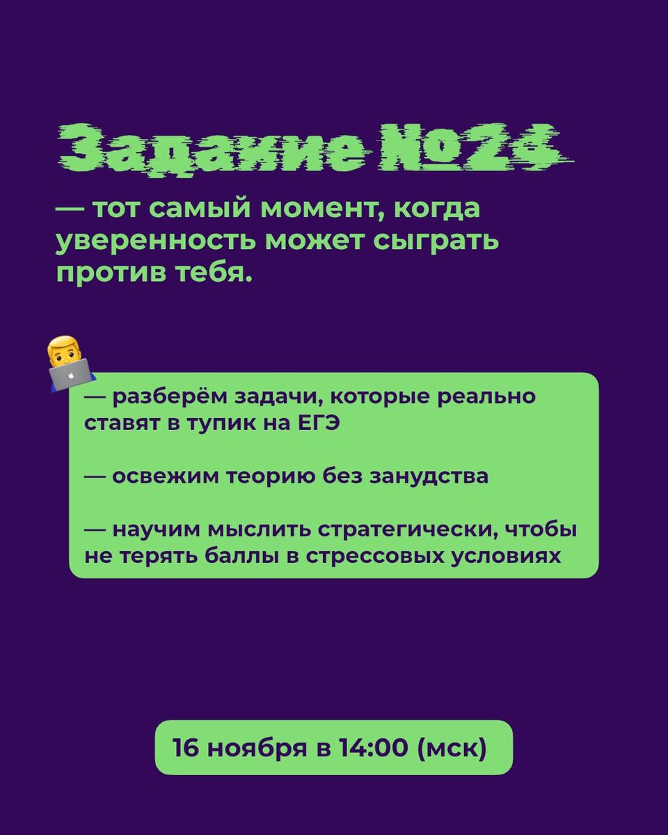 Задание №24 — тот самый момент, когда уверенность может сыграть против тебя. Кажется, всё просто, но стоит попасться нестандартной формулировке — и ты зависаешь. А время идёт и баллы теряются. 📅 16 ноября в 14:00 (мск) мы проведём бесплатный вебинар «Самое сложное задание №24». За пару часов ты научишься не просто решать, а распознавать ловушки и действовать чётко. На вебинаре: — разберём задачи, которые реально ставят в тупик на ЕГЭ — освежим теорию без занудства — научим мыслить стратегически, чтобы не терять баллы в стрессовых условиях 🎁 И сразу после — стартует марафон по 24-м задачам: С 17 ноября по 14 декабря — 4 недели практики, обратной связи и роста. Сдаёшь домашки в срок — участвуешь бесплатно. Если хочешь, чтобы №24 больше не был «страшным», — приходи.