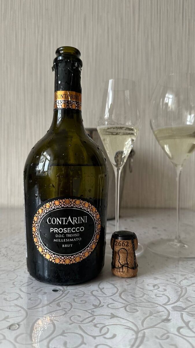 Contarini Prosecco DOC Millesimato Элу добрался до супермаркета "Да", а там что-то новенькое! Всегда с интересом смотрю, что привезли в "Да", потому что чаще всего там цена примерно такая же, как на полях в тех странах, где вино сделали. А это приятно! "Коммуна Ваццола, провинция Тревизо, область Венето, Италия. 100% Глера. Хоть и написано миллезимато, что означает виноград одного года сбора, но на оригинальной этикетке не указан какой именно. Аромат (!) фиалки и кофе. Вкус дыня-абрикос-минералы. Напиток деликатный, сильно не охлаждать. Температура в бокале 9-14 градусов. Для этого поддерживайте температуру в бутылке 4-9 градусов. 900 р. в Да в октябре 2025. Такие бутылки я уже видел там, но решился взять только недавно. Рекомендуется к дегустации сначала самому или в знающей компании. Далее можно и на корпоративе использовать."