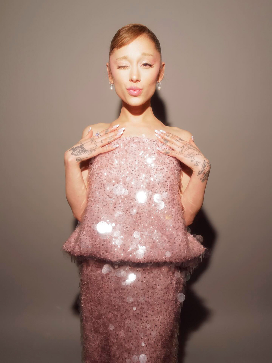 Ариана Гранде стала одной из первых звёзд, для которой новый креативный директор Balenciaga Пьерпаоло Пиччоли создал индивидуальный кутюрный образ. И кажется, именно «добрая ведьма» стала идеальной моделью для того, чтобы открыть новую, более ремесленную эпоху легендарного дома. Певица появилась в Сингапуре на премьере фильма «Злая 2», выйдя на красную дорожку вместе с Синтией Эриво и Мишель Йео. Стиль, который ей создал Ло Роуч, органично продолжил её идеально розовый и искрящийся гардероб всего пресс-тура — но в этот раз образ стал по-настоящему волшебным. Ариана Гранде Платье без бретелек нежного сахарно-розового оттенка было расшито россыпью пайеток разных форм и размеров, создающих киношное мерцание. Наряд с мягко заниженной линией талии, драпировками и плиссировками сзади, собранными в большой бант, переходил в длинный драматичный шлейф. По словам Роуча, это — первый кастомный кутюрный образ Пиччоли для Balenciaga. Дополнением стали длинные серьги от Swarovski и несколько колец.