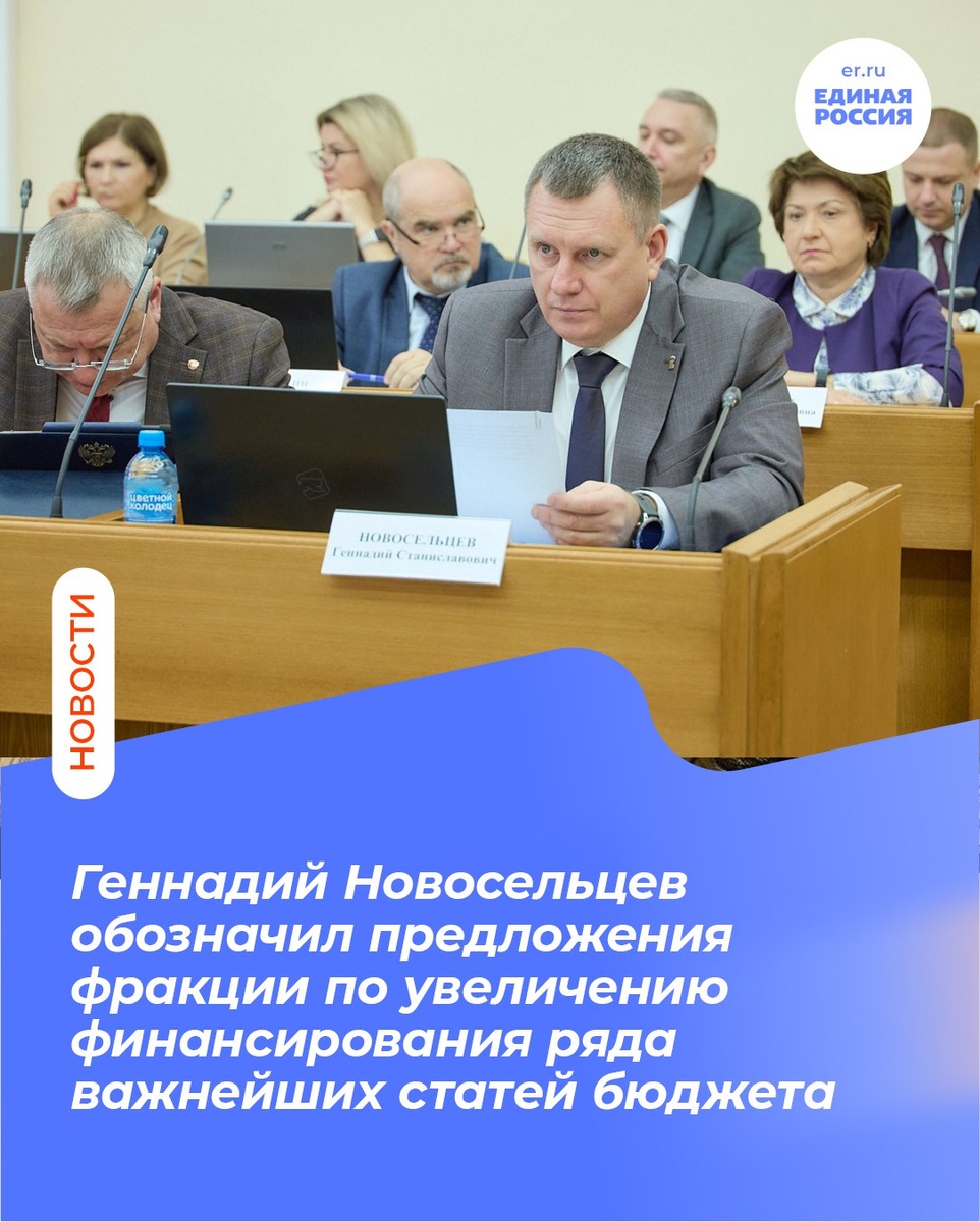 ▪️Председатель Законодательного Собрания Геннадий Новосельцев на публичных слушаниях по проекту областного бюджета на 2026–2028 гг. озвучил предложения фракции «Единая Россия» по увеличению ряда статей. Он отметил устойчивость бюджетной системы Калужской области, несмотря на санкции: сохраняются соцвыплаты, растёт экономика, строятся объекты. Новосельцев поблагодарил финансово-экономический блок и Валентину Авдееву за профессионализм. В рамках подготовки новой Народной программы фракция предлагает увеличить финансирование инициативного бюджетирования на 70 млн рублей — до 500 млн в 2026 году. Также предлагается дополнительно выделить 100 млн рублей на сертификаты для детей-сирот и увеличить финансирование подготовки к отопительному сезону на 10 %. Геннадий Новосельцев подчеркнул успехи в реализации программы «Чистая вода», а также необходимость усилить внимание к тепловому хозяйству региона. #ЕР40 #ЕдинаяРоссия