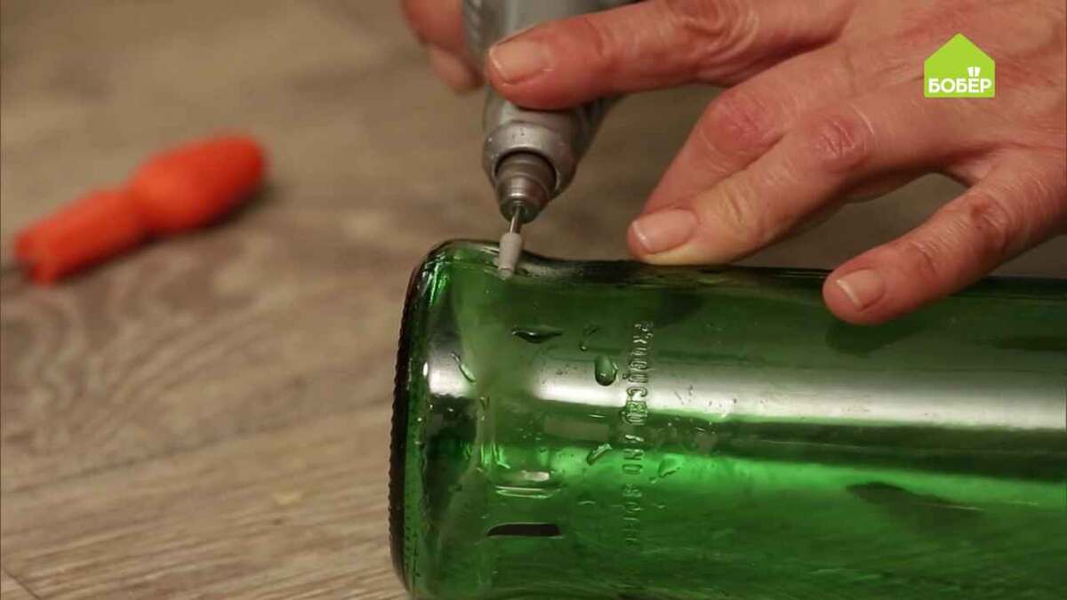 Наши советы помогут вам сделать основание для настольной лампы из любого стеклянного или керамического предмета. Творите! Место в бутылке, где планируется сделать отверстие, отшлифуйте мини-дрелью с буром с алмазным напылением, предварительно смочив поверхность. Во время работы смачивайте поверхность, чтобы стеклянная пыль не поднималась вверх. Начните постепенно углублять отверстие. Если диаметр отверстия меньше провода, его необходимо расширить. Смойте с бутылки остатки стеклянной пыли. Проденьте провод в получившееся отверстие. Наденьте перчатки, отрежьте небольшой кусочек холодной сварки и разомните в руках до однородности. Когда масса станет серого цвета, она готова к работе. Проденьте провод в ниппель с резьбой, который подходит к чашке патрона, таким образом, чтобы его гайка была внизу. Серую массу оберните вокруг ниппеля, сделав своеобразную пробку. Засуньте получившуюся пробку в горлышко бутылки, сделав сверху небольшой выступ. Ниппель должен располагаться строго вертикально