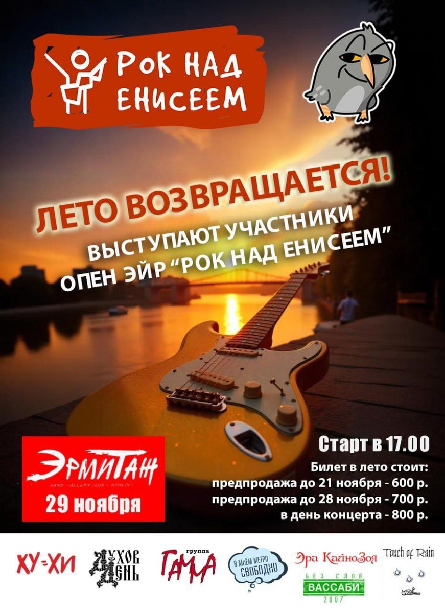 Дорогие наши ТГ-зрители и ВК-слушатели! Напоминаем, что 29 ноября в Красноярск возвращается лето, невзирая на календарь и погоду. Потому, что РОК НАД ЕНИСЕЕМ , а не какой-нибудь гладиолух. Целых 7 красноярских рок-групп, будут топить лёд и накалять атмосферу в определенном месте в определенное время. Но почувствует это, безусловно, весь город. Засеките температуру на градуснике и запишите в дневник наблюдений. Потом сверим данные. Напишем лабораторную. "Эра КаноЗоя" начнёт жечь уже в 17.00. Не опаздывате. Пароли, явки здесь👉 vk.cc/cQn7E8 За билетами со скидкой обращайтесь к музыкантам лично, заранее.