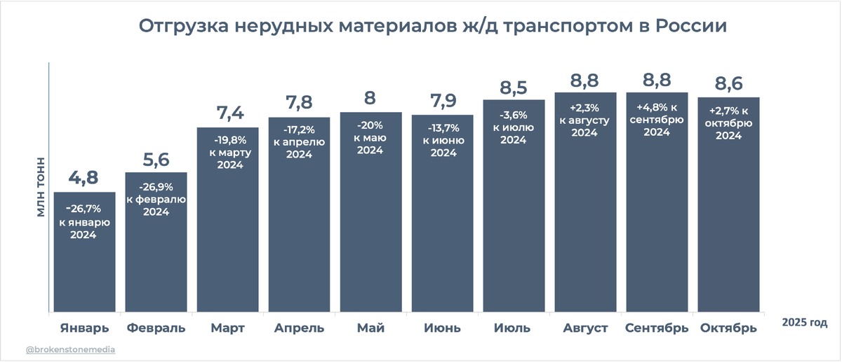 Анализ отгрузок нерудных стройматериалов ж/д транспортом в РФ за октябрь 2025 года