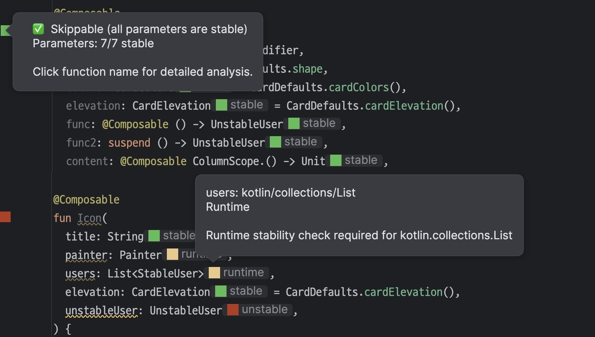 🛠️ Анализ стабильности Jetpack Compose Compose Stability Analyzer — это плагин для Android Studio, который предоставляет визуальный анализ стабильности ваших composable-функций в реальном времени. Он помогает выявлять причины нестабильности и оптимизировать производительность через трассировку и логирование. 🚀Основные моменты: - Графические индикаторы стабильности в редакторе. - Подсказки при наведении с детальной информацией. - Инлайн-значки для параметров с их статусом стабильности. - Быстрые исправления и предупреждения для нестабильных composables. 📌 GitHub: https://github.com/skydoves/compose-stability-analyzer #kotlin