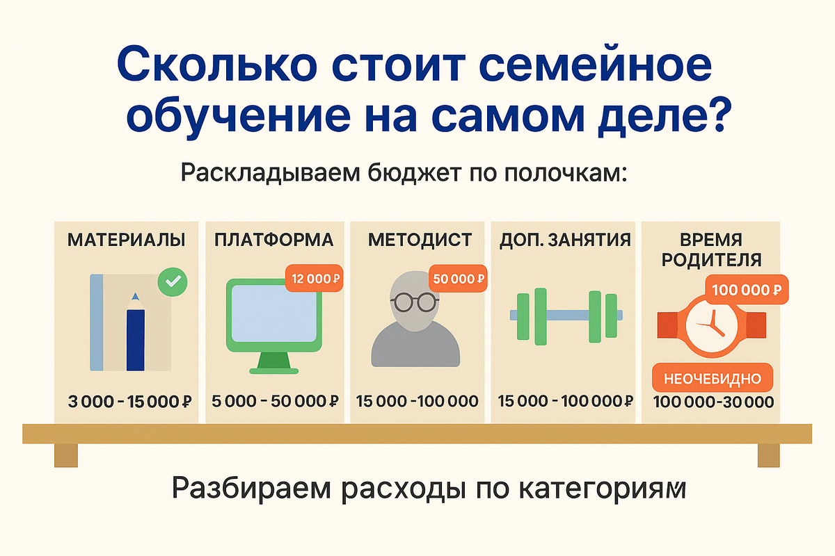 Когда мы переводили ребенка на семейное обучение, я была уверена: "Экономия будет минимум 30%!". Реальность оказалась сложнее. После 8 месяцев ведения учета я готова показать, из чего реально складывается бюджет, и где таятся самые неочевидные траты. P.S. В конце статьи вас ждет готовая таблица для расчета вашего бюджета. Что входит: Онлайн-школа с куратором и проверкой работ Реальные цифры: - Эконом-вариант: ИнтернетУрок — от 1 290 ₽/мес × 9 месяцев = 11 610 ₽ - Средний вариант: Фоксфорд — от 2 500 ₽/мес × 9 месяцев = 22 500 ₽ - Премиум: Алгоритм — от 5 000 ₽/мес × 9 месяцев = 45 000 ₽ "Мы выбрали средний вариант за 30 000 ₽ в год, но добавили курсы по программированию — итого 55 000 ₽" Что входит: Кружки, спортивные секции, репетиторы. Неочевидные траты: - Инвентарь: Спортивная форма, музыкальные инструменты - Проезд: Если занятия офлайн - Соревнования/конкурсы: Взносы и поездки. Что входит: - Ноутбук/планшет (25 000 ₽). - Наушники с шумоподавлением (5 000 ₽). - Эргономичное кресло