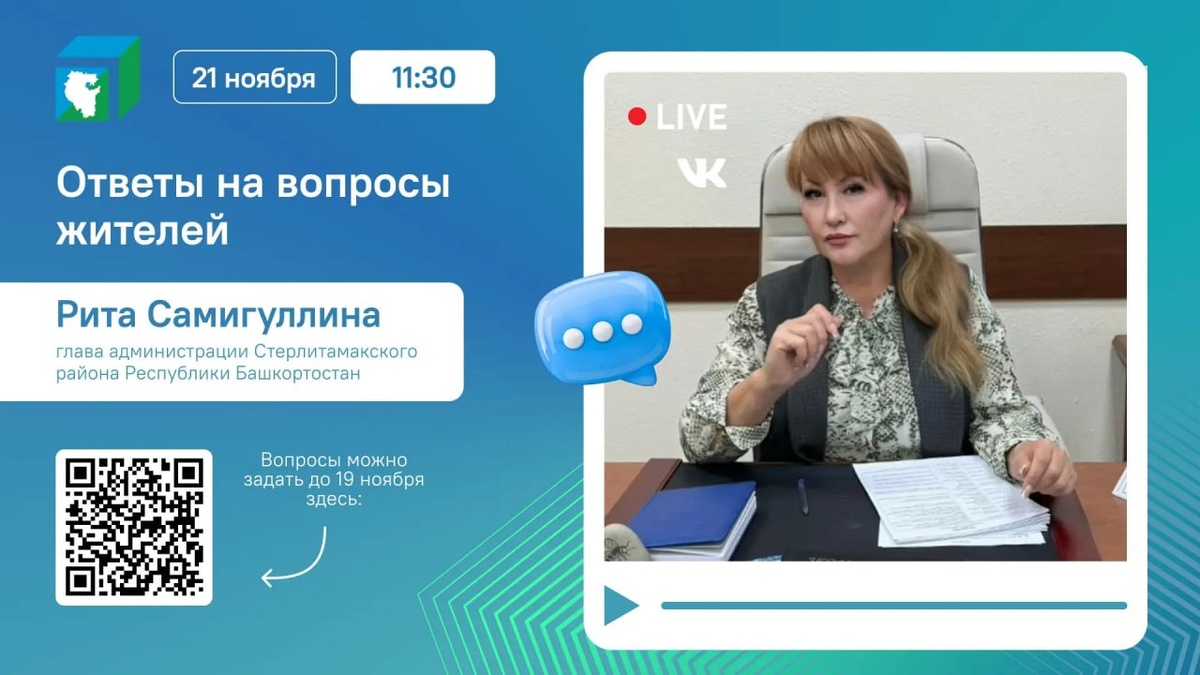 21 ноября в 11:30 в прямом эфире из ЦУР Башкортостана – глава Стерлитамакского района Рита Самигуллина. Свои вопросы вы можете прислать заранее через платформу обратной связи «Госуслуги Решаем вместе»: https://pos.gosuslugi.ru/lkp/direct-line/10613 Обращения принимаются до 19 ноября 2025 года включительно. 💚 ЦУР Башкортостана