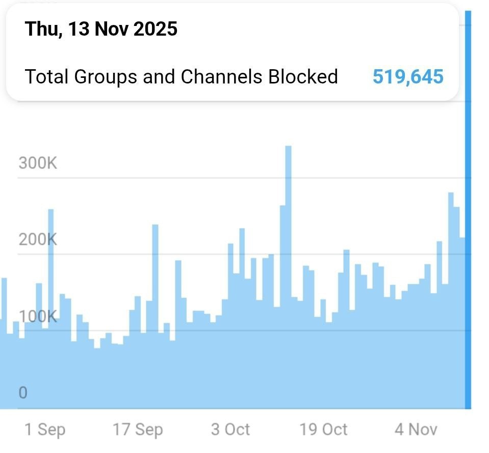 Вчера в Telegram заблокировали больше 519 645 групп и каналов это самый высокий показатель за всю историю сервиса