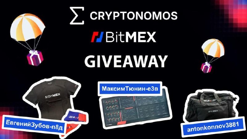 🥳 🏆 Поздравляем с победой в розыгрыше от Cryptonomos & BitMEX и благодарим за участие 🤗 🪂Мерч от BitMEX выиграли: 1. antonkonnov3881 - 🕶 Клевая спортивная сумка 2. МаксимТюнин-e3в - ⌨️ Крутой коврик для трейдера с паттернами 3. ЕвгенийЗубов-п8д - 🥤 Неотразимая футболка + носки 👋 Свой UID BitMEX для сверки данных и адрес для получения выигрыша пришлите Роману - @leonovdev (отправим СДЭКом) Участвуйте и выигрывайте 🏆😎 #Cryptonomos #GiveAway