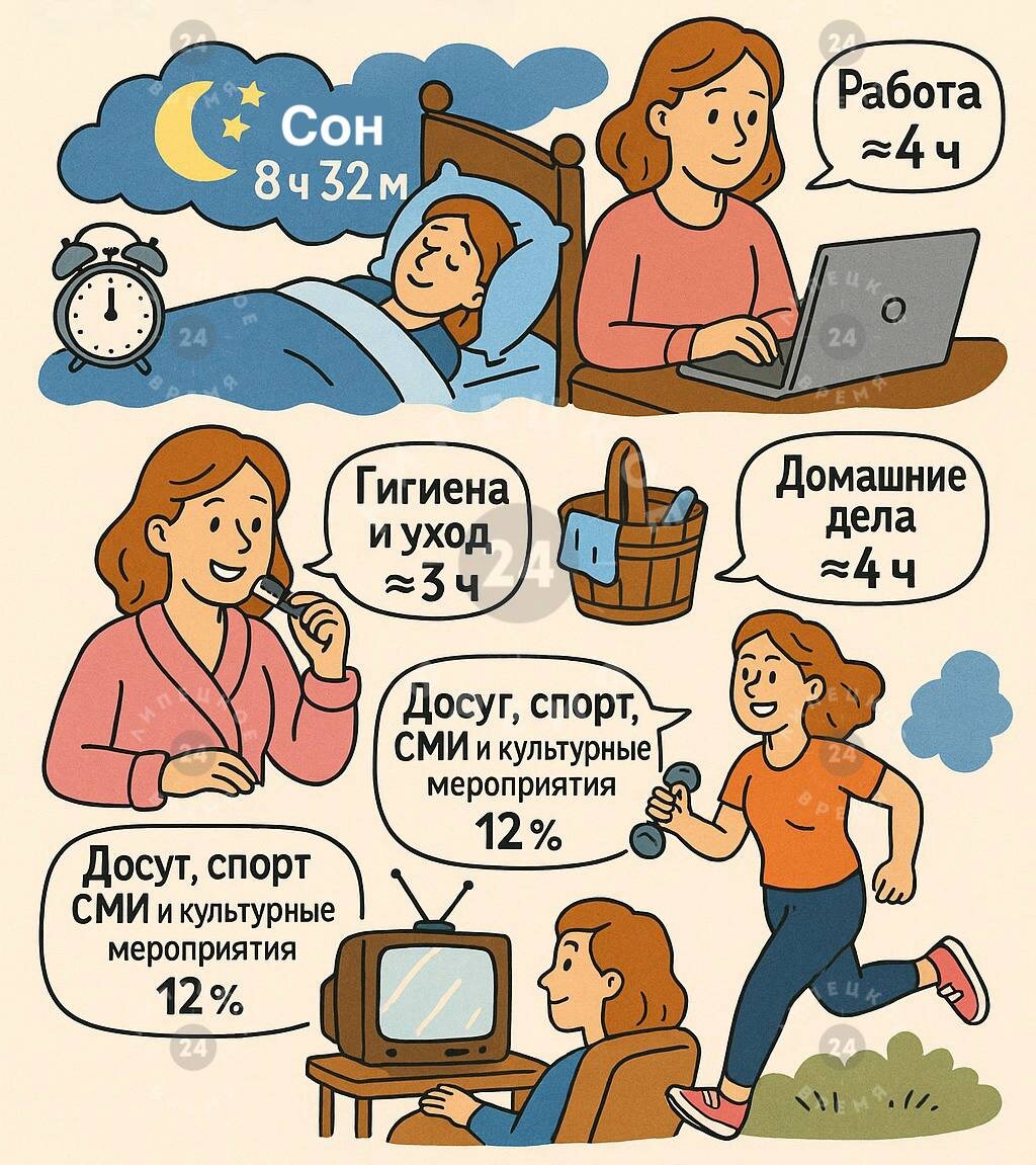 Росстат показал, как проходит день среднестатистической липчанки Согласно исследованию, больше всего времени у липчанок уходит на сон — в среднем 8 часов 32 минуты в будни и ещё на полчаса больше в выходные. Работе (с учётом неоплачиваемой деятельности) женщины посвящают около 4 часов в день — столько же, сколько и домашнему хозяйству. В выходные бытовые дела и забота о детях занимают на час больше. На личную гигиену и уход за собой уходит около 3 часов ежедневно. Досуг, спорт, СМИ и культурные мероприятия занимают 12% времени, ещё 5% — общение и участие в общественной жизни.