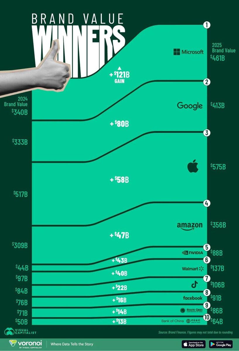 Несмотря на весь Ml-бум последних лет, больше всего прибавили в цене за последний год "старые" IT-бренды: Microsoft (+$121.000.000.000 к цене бренда), Google (+$80.000.000.000) и Apple (+$58.000.000.000) Из очевидно связанных с Ml историй - только NVIDIA на пятом месте (+43 миллиарда долларов к цене бренда - зато это рост почти в два раза всего за год!), а так тут даже старый-добрый оффлайн-ритейлер Walmart затесался в список лидеров!..