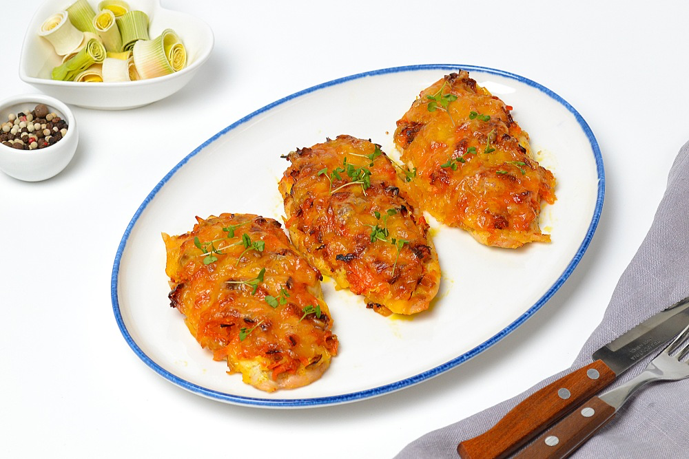 Пищевая ценность на 100 г Калории 139 ккал Белки 15 г Жиры 7 г Углеводы 3 г Ингредиенты: Филе куриное – 1 кг Лук-порей – 300 г Морковь – 300 г Сыр полутвердый – 200 г Сметана – 100 г , 20% Масло растительное – 50 мл Приправа – 1 ч.л. , "Для курицы" Рецепт: Подготовить ингредиенты. Мясо разморозить заранее. Филе разрезать на 2-3 части вдоль. Каждый кусок несильно отбить молоточком. Выложить на противень, застеленный пергаментом. Посыпать специями и оставить на 15 минут. Нарезать лук, морковь, натереть сыр. Разогреть масло и обжарить лук, добавить морковь. Обжарить все вместе минут 6. Филе смазать сметаной. Выложить сверху овощную смесь. Поставить в духовку и запекать 15 минут при 200-210 градусах. Затем посыпать сыром, немного уменьшить мощность и запекать еще 20 минут. Достать противень с отбивными. Подать куриные отбивные под шубой в горячем виде. Приятного аппетита!