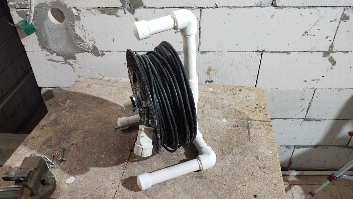 В качестве ручки, привинтил кусок шпильки. А чтобы не слетала с "катушек" наша катушка, засаморезил клипсу для 25 трубы через втулку, чтобы гайки не цеплялись. Надо было и розетки сменить, а то их раствором закидало жестко, но это уже на будущее.