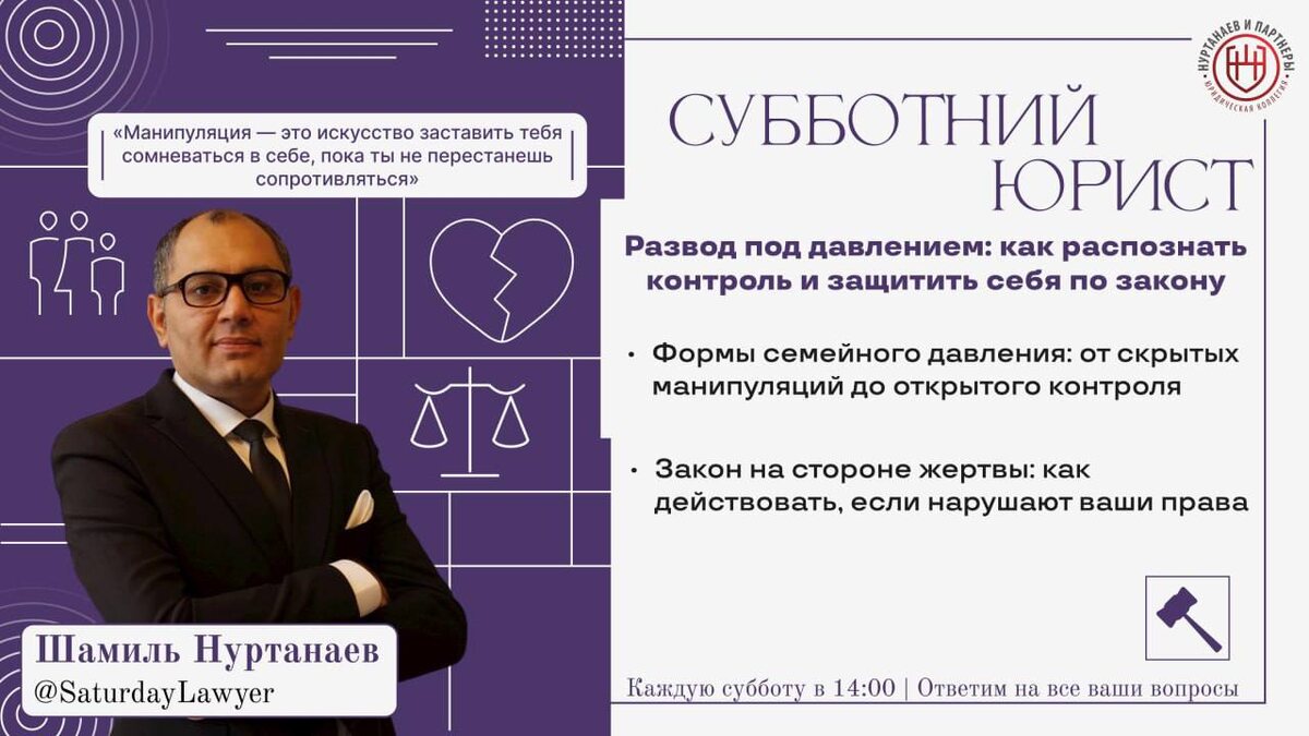 ⚡️⚡️⚡️⚡️Развод под давлением: как распознать контроль и защитить себя по закону? Об этом и о многих других вопросах мы поговорим завтра 15 ноября на очередной трансляции "Субботнего Юриста" ⚖️ Эфир проведет юрист с более, чем 20 летней практикой – Шамиль Нуртанаев (нажав на имя вы можете узнать о юристе больше). Тема эфира: «Под маской заботы» 📝 Вот основные вопросы, которые мы обсудим в эфире: 1. Формы семейного давления: от скрытых манипуляций до открытого контроля 2. Закон на стороне жертвы: как действовать, если нарушают ваши права Также, каждый может задать свой вопрос любым удобным для вас способом, перейдя по ссылке: https://clck.ru/3ByDxh Или же просто напишите вопрос в комментариях к посту Получите юридическую консультацию, не выходя из дома! 🎥 Записи эфиров на нашем Rutube: https://rutube.ru/channel/40148985/ VK Видео: https://vk.com/video/@vk.nurtanaev Дзен: https://clck.ru/3DQGpA ⚡️⚡️⚡️⚡️Трансляция пройдет на платформе VK Видео и Rutube, по ссылкам ниже👇 ✅ При