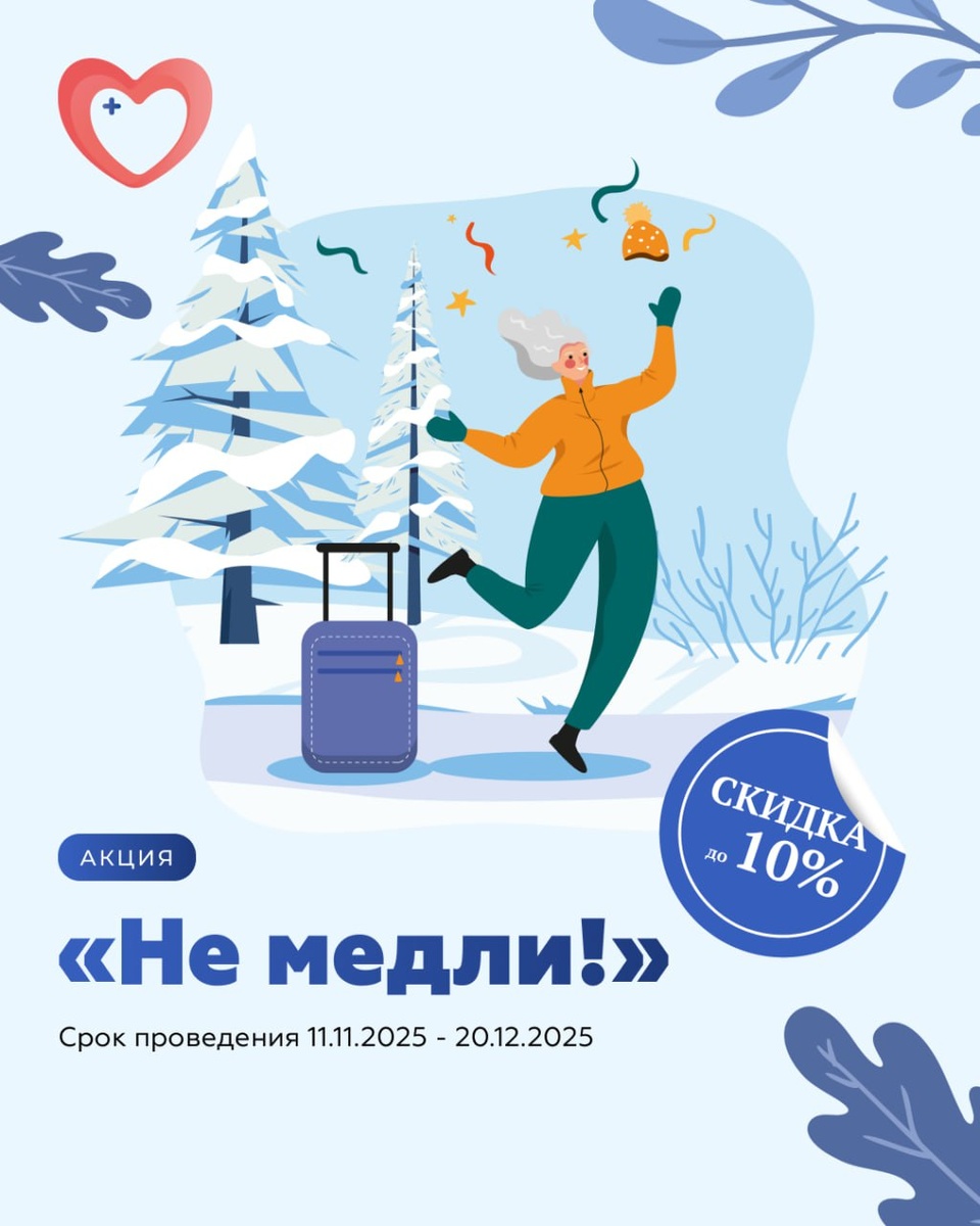 Забота о здоровье стала выгоднее! ✨ Мы запускаем специальную акцию для наших гостей, которая делает качественное лечение еще более доступным. Условия акции: 🎁 Проживание от 7 суток — скидка 5% 🎁 Проживание от 14 суток — скидка 10% Акция действует для ключевых лечебных программ: ✅ «Кардиопрофилактика» ✅ «Лечение» ✅ «Восстановление» (включая ранний период) ✅ «Иммунитет-антистресс» Это прекрасная возможность пройти полноценный оздоровительный курс по привлекательной цене! Узнайте подробности и оформите бронирование по телефону 📞 +7 (495) 105-90-92