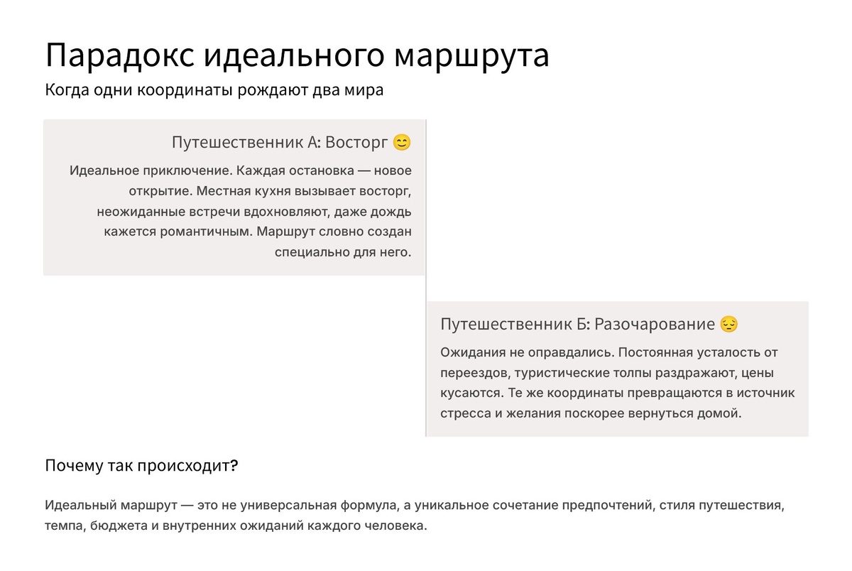 Вы запросили маршрут у своего хорошего знакомого, который привел его в полный восторг во время путешествия. Те же виды, ты же рестораны, те же мастерские. Но когда Вы прошли по нему шаг за шагом, вместо ожидаемого восторга – усталость и разочарование. Это не ошибка в маршруте – это “парадокс идеального маршрута путешествия”. Один и тот же набор координат может стать для одного путешествием мечты, а для другого не подойти вовсе. Почему один и тот же Париж для Вас и Вашего партнера оказывается двумя разными городами? Как семьи с детьми, влюбленные пары и компании подруг буквально живут в параллельных туристических реальностях? И главное – как наконец перестать следовать чужим советам и начать путешествовать по зову сердца и собственных желаний? Ответы – в моем исследовании, которое перевернет Ваш подход к планированию путешествий.