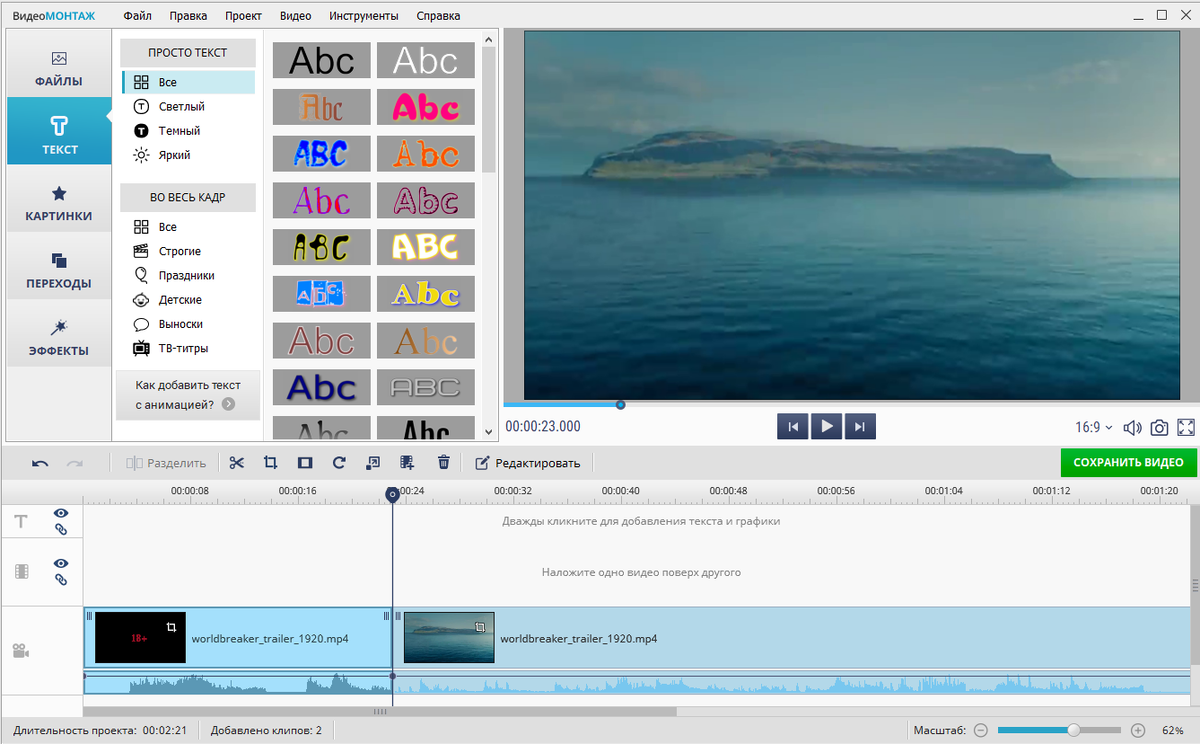 Это удобный редактор от российских разработчиков. Сильная сторона программы – универсальность. Простой интерфейс позволяет создавать ролики с эффектами и интересным монтажом даже новичкам. Вы сможете нарезать видео, удалить лишние фрагменты и вставить новые, склеить их с помощью переходов, наложить эффекты и музыку из библиотеки и т.д.
