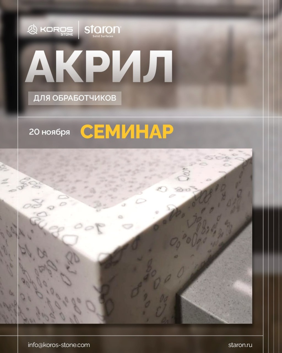 Хотите работать с камнем? Начните правильно! Два ноябрьских интенсива от Koros Stone: 20 ноября | Интенсив по акриловому камню Вы узнаете всё: от свойств материала и выбора инструмента до тонкостей полировки и способов избежать дорогих ошибок. 27 ноября | Интенсив по кварцевому камню Разберем специфику работы с кварцем, обсудим реальные кейсы и дадим практические советы для старта в профессии. Ведущий: наш бессменный эксперт по камню Дмитрий Желтоногов, технический директор Koros Stone. Приносите свои самые сложные вопросы! 🗓 Когда: 20 и 27 ноября, с 11:00 до 16:00 📍 Где: г. Домодедово, ул. Логистическая, 8 (учебный центр Koros Stone) 📩 Запись через вашего менеджера или на почту info@koros-stone.com