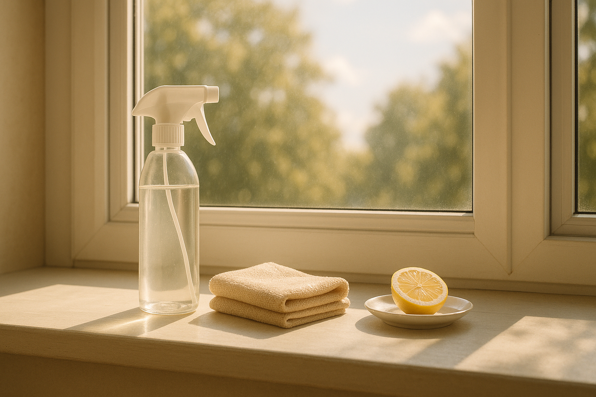 Хорошая новость: вернуть стеклу прозрачность можно легко — без дорогих средств и нервов. Смешайте в пульверизаторе уксус и воду 1:1.