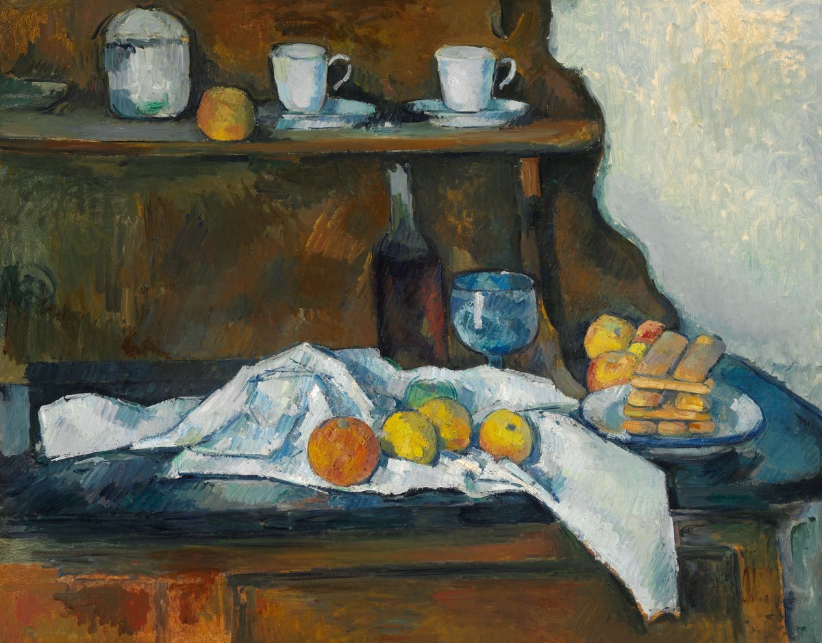 Эта картина Поля Сезанна (1839-1906) прекрасно иллюстрирует наблюдение выдающегося искусствоведа Эрнё Каллаи, редактора журнала «Bauhaus»: Сезанн своим идеалом считал объёмные, скульптурные формы старых мастеров. Его стремлением было создать прочную, живописную конструкцию из воздушных красок импрессионистов… в своих натюрмортах он наносил краску на холст небольшими мазками, из которых постепенно проступали формы и объёмы изображённых предметов. Тоновый баланс искался между двумя соседними мазками цвета. Помимо интересного использования цвета, здесь создана необычная композиция. Резные боковые панели комода, геометрические узоры из аккуратно расставленных столовых приборов, фруктов и печенья, игра форм и структурный рисунок кистью делают эту работу ключевой в творчестве художника. Здесь можно увидеть как ранний период "барочный" период Сезанна, так и “архитектурную живопись”, которую он совершенствовал с 1880-х годов. Местами его манера письма отражает уход от импрессионизма. Рестав