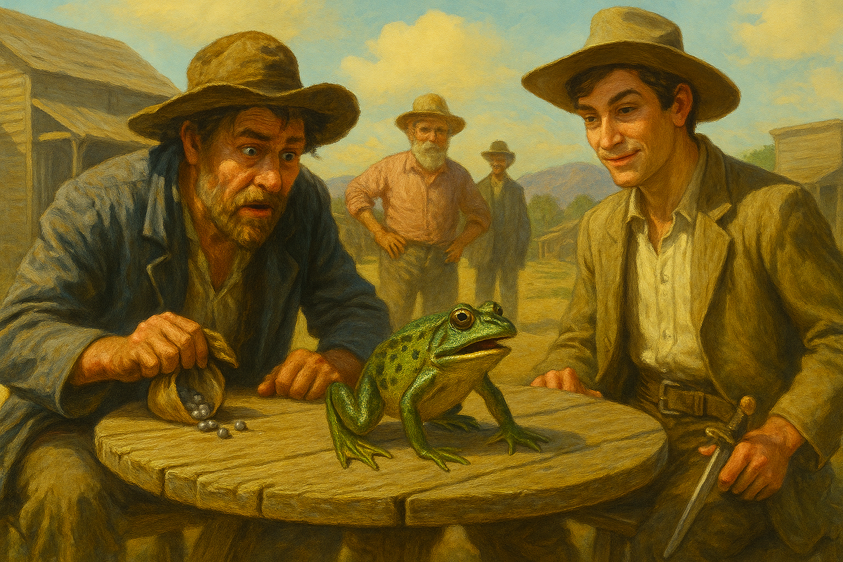 Небольшой рассказ, повествующий о Джиме Смайли - необычном жителе, проживающем в местечке Калаверас, Калифорния, который прославился, как самый азартный человек в округе. Кого только не держал Смайли в своём «зоопарке» для заключения выгодных пари: и петухов, и кошек, и собак и даже лошадей. Однако, самым ценным «экземпляром» в его коллекции была дрессированная лягушка по прозвищу Даниэль Уэбстер, которая по праву считалось самой прыгучей не только во всём штате, но и на целом Западном побережье. Однажды, новичок в посёлке спорит с Джимом на то, чья лягушка быстрее его или Смайли. Начинается забег и неожиданно для всех, Даниэль Уэбстер проигрывает, практически не сдвинувшись с места. Карманы предприимчивого и опытного в этих делах спорщика опустели на целых сорок долларов. Обескураженный поражением Смайли, приподняв лягушонка, обнаруживает, что его ловко провели, ведь живот Даниэля набит металлической дробью.