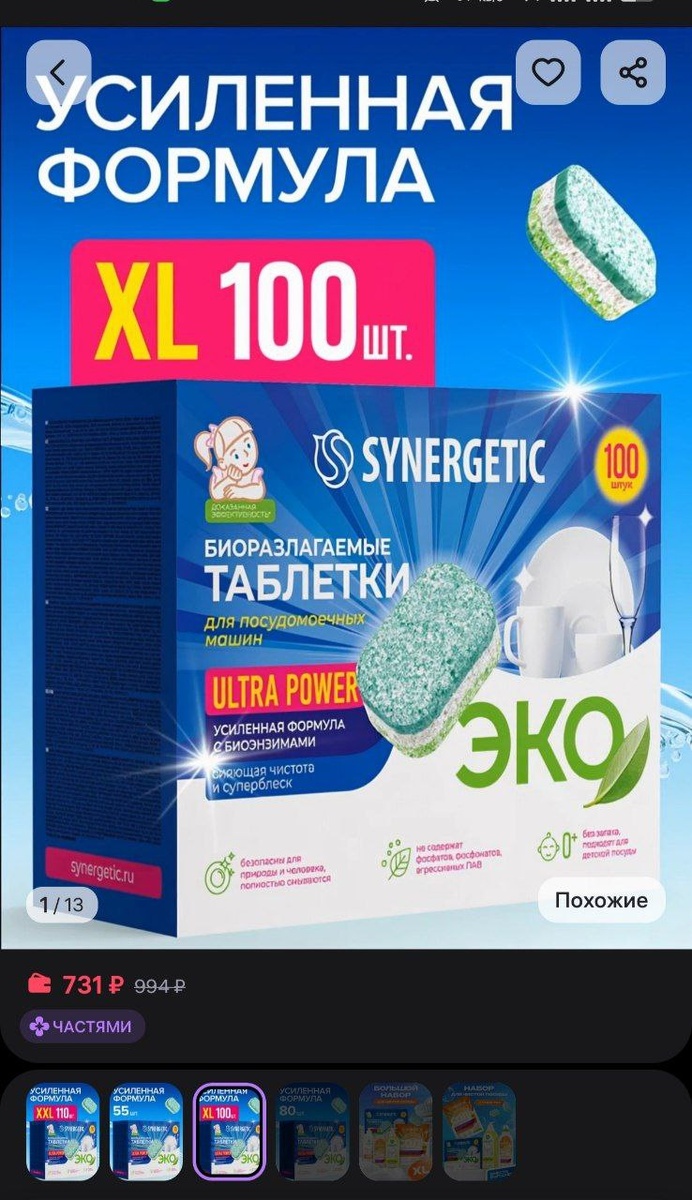 Таблетки для посудомоечной машины ULTRA POWER, 100 шт. SYNERGETIC за 731₽