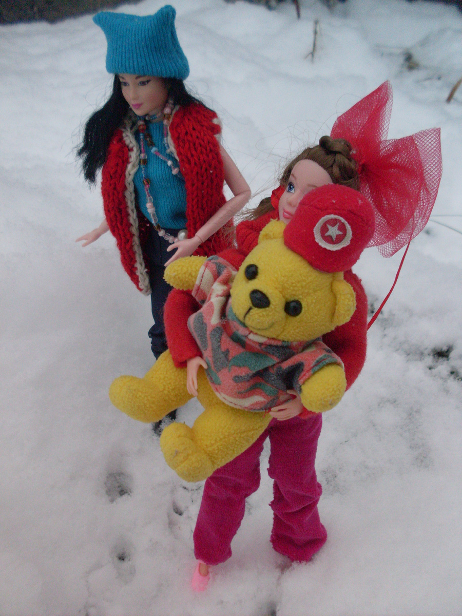 Здравствуйте мои дорогие! Сегодня весь день снегопад, к вечеру чуть утих. Дюймовочка с Мали побежали смотреть, сколько выпало снега. Вышли налегке. На улице -5, но они сильно торопились выйти пока не стемнело. Мали показываю впервые. Надо будет ей отдельную фотосессию сделать. Она у меня любительница роз. Имеет свой розалий и даже зимой они радуют активным цветением. Дюймовочка выскочила со своим мишкой показать и ему снегопад. Пока я отвлеклась на слетающие сапоги Мали, Дюймовочка уже залезла в снег... Дюймовочка хоть и маленького роста, а снега ей уже по пояс! Плюхнулась и лежит смотрит, как с неба спускаются снежинки. Мали подошла к ней и зовет вставать и идти скорей домой. Мали хочет помочь подняться Дюймовочке. Выбралась из снега, чуть отряхнулась и попросила фото с её мишкой. Мали явно замерзла. Дюймовочка довольная, ей пока не холодно. Мы быстро убежали в тепло. Мои руки окоченели и не двигались пальцы, но я тоже довольная. Фотографировать очень люблю. Историю о там