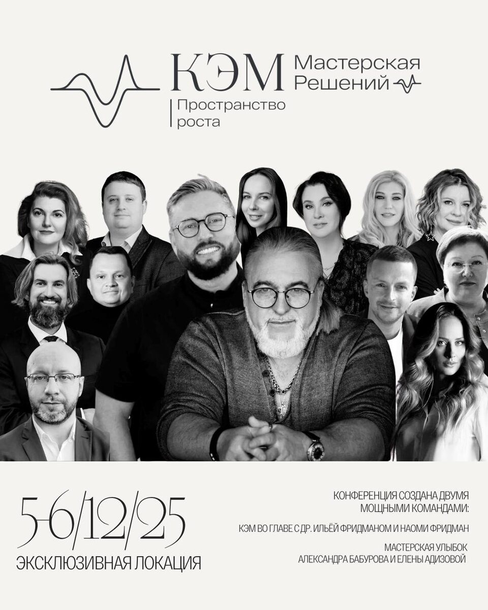 КЭМ.Мастерская решений — уникальная конференция лидеров стоматологии и эстетической медицины! Впервые КЭМ во главе с Ильей и Наоми Фридман и Мастерская Улыбок Александра Бабурова и Елены Адизовой объединяют опыт, чтобы создавать решения, которые изменят будущее вашего стоматологического бизнеса. Один из роскошных особняков Петербурга превратится в закрытый клуб управленцев: ➕особая интеллектуальная среда ➕мудрость опыта, собранного в узком круге лидеров ➕откровенность, доступная лишь в доверительной камерной среде ➕результат, выраженный в стратегиях, которые невозможно найти в открытых источниках В программе: Илья Скляров, Александр Жаров, Елена Шестопалова, Елена Зяблова, Александр Семенов, Роман Игонин, Лиана Давидян, Ульяна Газарова, Наталья Мусинова, Юлия Клоуда, Ольга Зиновьева, Александр Шиманский, др. Илья Фридман и др. Александр Бабуров. 🦷 DentalPRO — генеральный партнёр конференции 🗓 5-6 декабря 📍 Санкт-Петербург, особняк Мясникова места строго ограничены! Регистрация