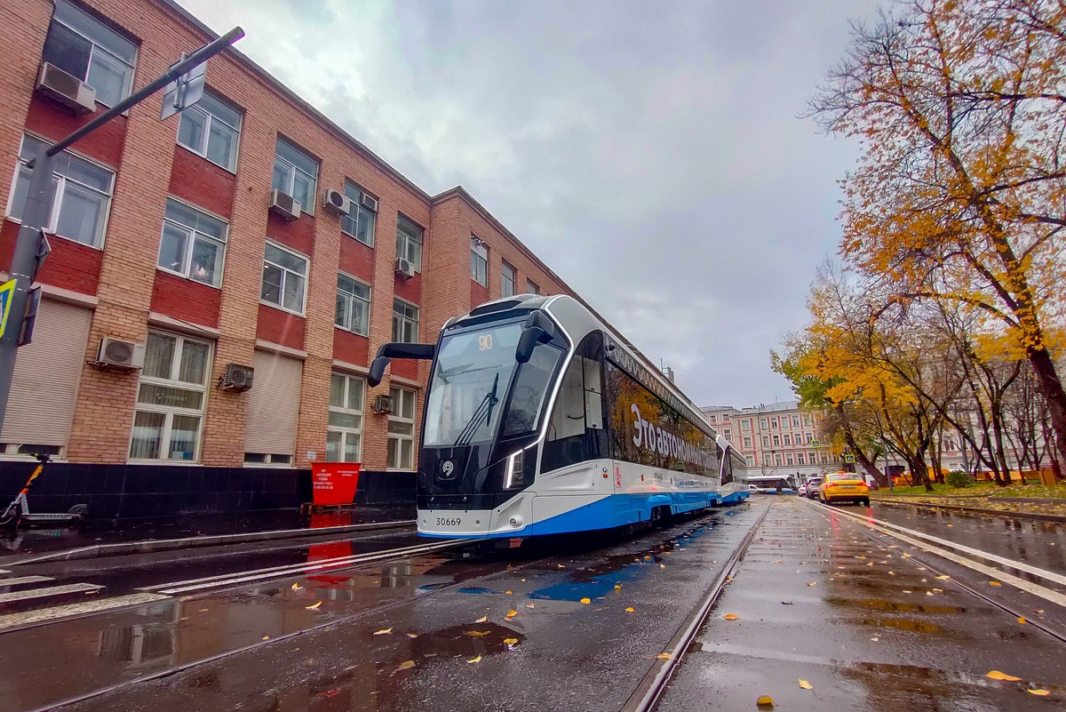 В дождливый день осени трамваи 71-911ЕМ «Львёнок-Москва» проходят пусковую наладку