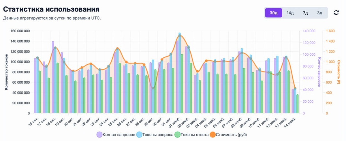 Залез посмотреть статистику использования ИИ для рерайта в poisk.im. Вот, делюсь. В сутки около 200 млн. токенов (совокупно запрос + ответ)! Рекорд - в начале ноября за один день под 300 млн. токенов обработали. Присматриваюсь с картинкам, но пока дороговато. И как обычно жду понижение цен на токены... Хотя, чего уж греха таить - и так не очень дорого для на наших объемов. Русский ИТ бизнес