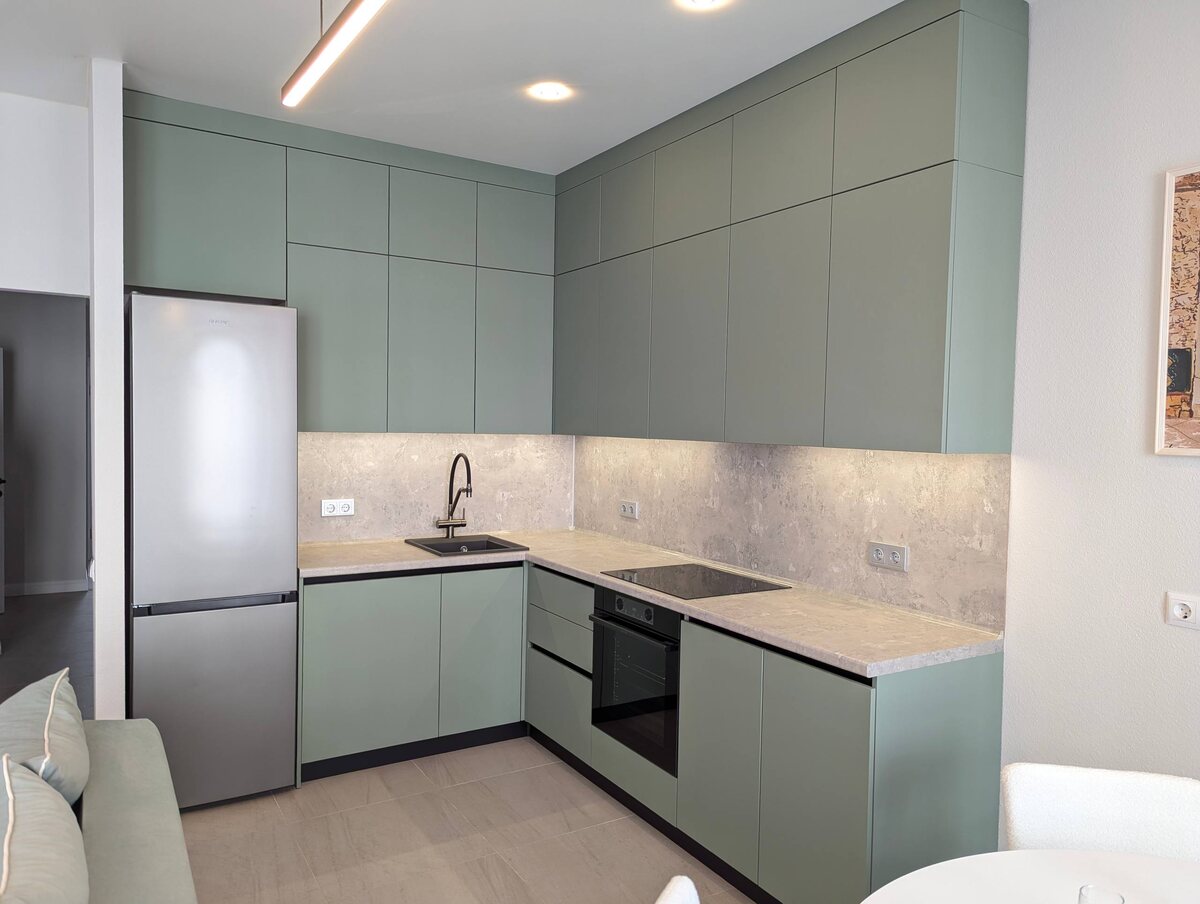 К нам обратилась клиентка с запросом - сделать кухню под сдачу. Это должно быть качественно, но не очень дорого. Ничего лишнего, без пафоса - только комфорт и стиль. Нужно было создать максимально эргономичное пространство. Так родилась эта аккуратная L-образная композиция. Она не только удобна, но и визуально делает помещение просторнее. Благородный оттенок нежной зелени дарит ощущение спокойствия и лёгкости. В паре с текстурой каменной столешницы кухня выглядит современно, но при этом уютно. Размеры, описание и цена: 🔸4100 × 2850 (высота) мм 🔸 Фасады: МДФ 16мм Эвкалипт FG176 софт 🔸 Столешница: 38 мм, в пластике Бетао 🔸 Фурнитура: Блюм + Firmax 🔸 Ручки: Низ - профиль Гола черный, верх - опуск фасадов 20мм, барные - ti-pon Boyard 🔸 Светодиодная подсветка рабочей зоны с ИК-датчиком Цена 307 000 (август 2025) включая столешницу, но без техники. В Optima mebel вам помогут сделать правильный выбор! г. Пушкино, Московский проспект, 59. ТЦ «Круиз» 3 эт. Ежедневно 10:00 - 19:00 📲