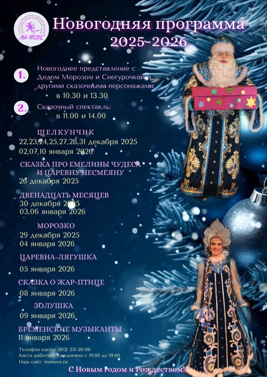 Принимаем коллективные заявки на предстоящие Новогодние программы, в которые входит Волшебное представление у Новогодней Елки с Дедом Морозом, Снегурочкой и другими сказочными персонажами, чудесный спектакль по мотивам произведений популярных детских писателей и русского народного творчества. 22пн.,23вт.,24ср.,25чт.,27сб.,28вс.,31ср. декабря 2025 года в 11.00 14.00 смотрите ЩЕЛКУНЧИК 26 декабря 2025 года, пятница, в 11.00 и 14.00 смотрите СКАЗКУ ПРО ЕМЕЛИНЫ ЧУДЕСА И ЦАРЕВНУ НЕСМЕЯНУ tnaneve.ru/spektakli/... 29 декабря 2025 года, понедельник, в 11.00 и 14.00 смотрите МОРОЗКО tnaneve.ru/spektakli/... 30 декабря 2025 года, вторник, в 11.00 и 14.00 смотрите ДВЕНАДЦАТЬ МЕСЯЦЕВ tnaneve.ru/spektakli/... Обращайтесь по телефонам: Касса (812) 251-20-06 Билетный стол: (812) 575-41-04; (812) 495-35-80