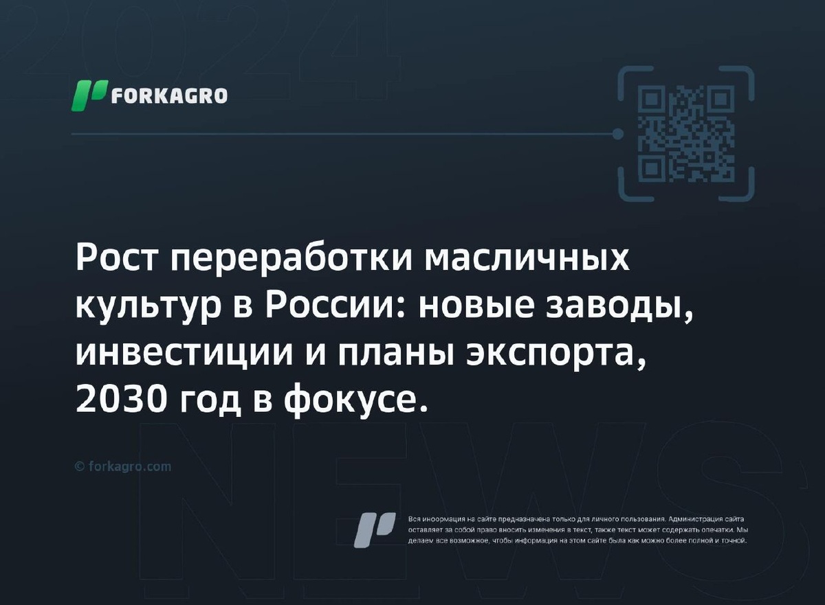 Рост переработки масличных культур в России: новые заводы, инвестиции и планы экспорта, 2030 год в фокусе. Минсельхоз России прогнозирует рост экспорта растительных масел и шротов за счет увеличения мощностей по переработке сои, рапса, льна. За три года объем переработки масличных культур вырос на 21%, достигнув 34,5 млн тонн к концу 2025 года. Объем поставок российских растительных масел за рубеж увеличился на 10% до 5,4 млрд долларов за январь — сентябрь 2025 года. Новые заводы планируют построить в нескольких регионах России, что увеличит производственные мощности отрасли. Перейти к источнику
