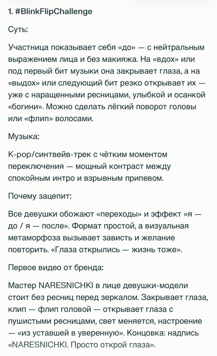Создавайте свои тренды #нейросетисэксперткой #маркетингсэксперткой А давайте сегодня протестируем промпт по созданию тренда для своего продукта. Я поставила продукт одной из учениц с потока бесплатной школы - она занимается наращиванием ресниц и вот что получилось. Результат первой итерации в приложенных скринах. Сам промпт доступен для копирования ниже: Ты — креативный директор маркетингового агентства с опытом вирусных кампаний. Контекст: - Бренд: [название и сфера, например, "локальный бренд джинсовой одежды"] - Целевая аудитория: например, Gen Z, 18-25 лет, активны в TikTok и Instagram - Бюджет: минимальный, основной упор на органический охват - Цель: запустить UGC-челлендж с потенциалом 10+ млн просмотров Задача: Разработай 3 концепции вирусного челленджа, которые: 1. Просты для повторения (действие занимает 15-30 секунд) 2. Визуально привлекательны для соцсетей 3. Связаны с продуктом естественным образом 4. Имеют эмоциональный крючок или элемент соревнования Для каждой